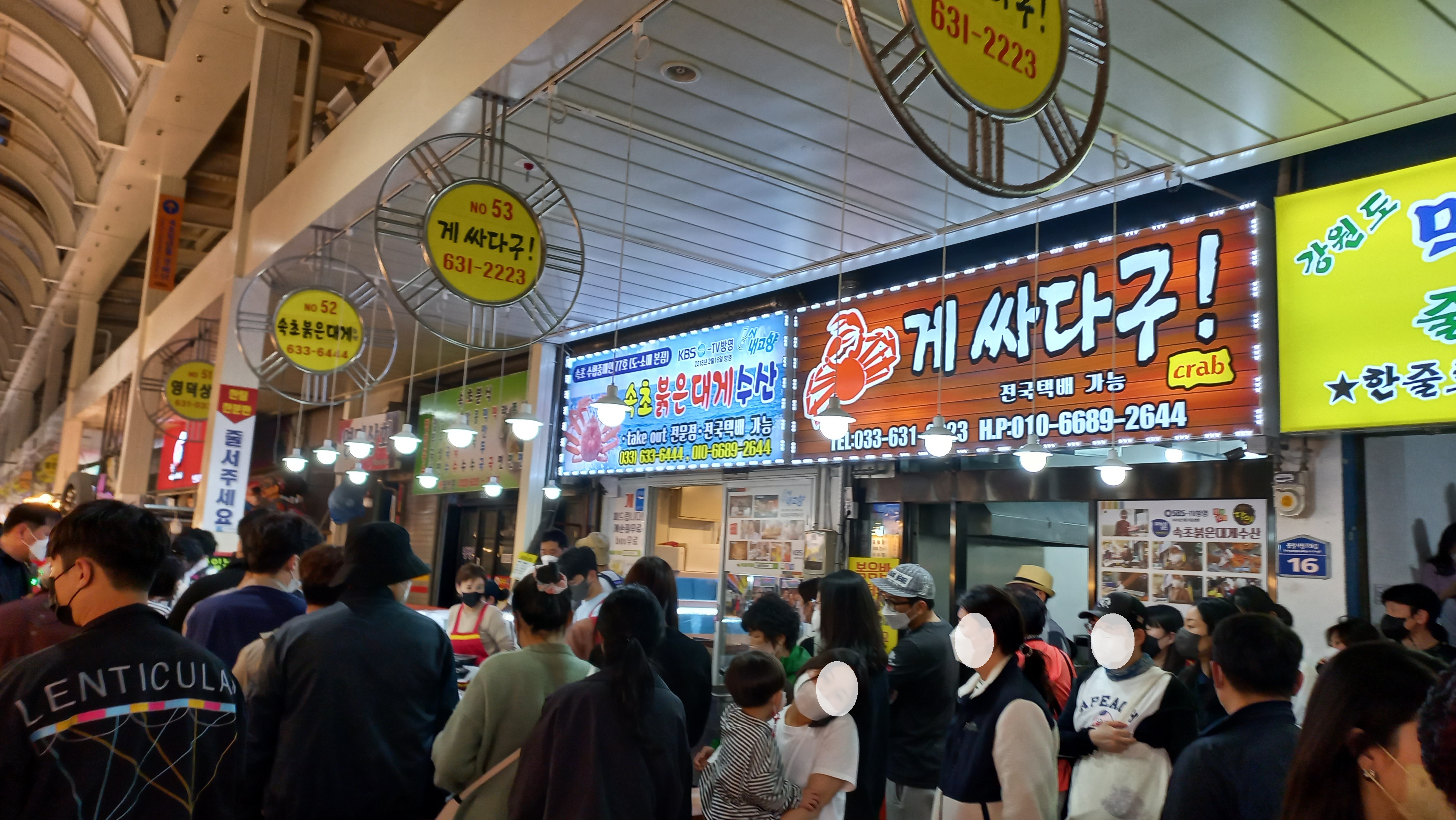 특히 속초관광수산시장엔 전통시장 외에도 순대, 닭강정, 튀김, 회, 대게, 홍게, 수산물 등 바로 먹을 수 있는 풍성한 먹거리가 있는 시장입니다.