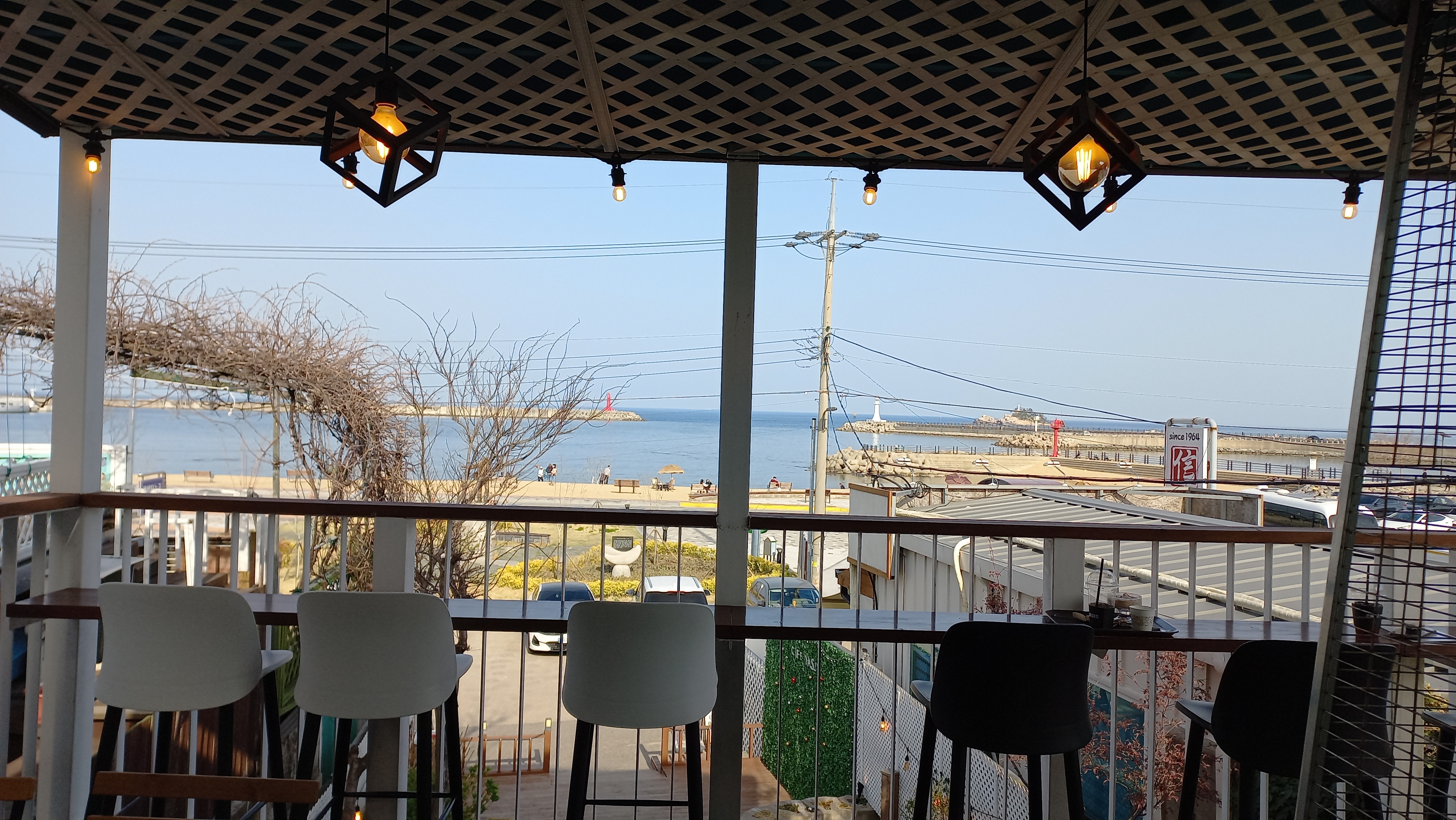 아바이마을 대부분이 건물이 단층건물인데 2층 건물에 테라스가 있는 카페를 발견해서 들어갔습니다.