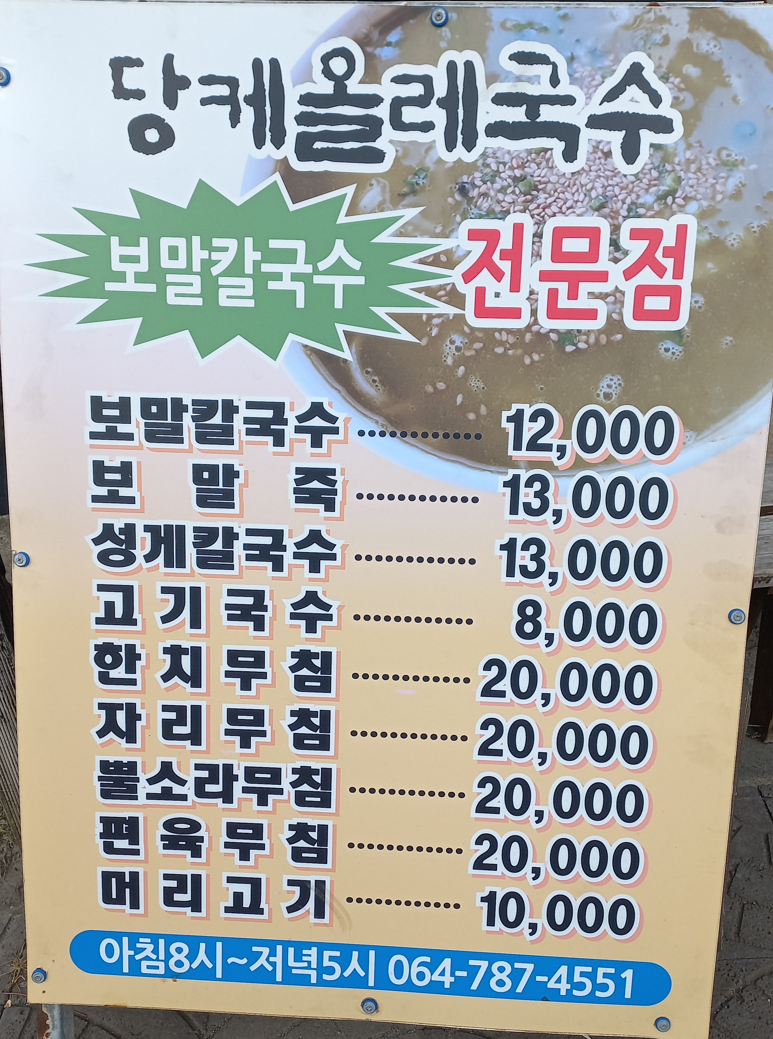 보말칼국수 12,000원, 보말죽 13,000원, 성게칼국수 13,000원, 고기국수 8,000원
