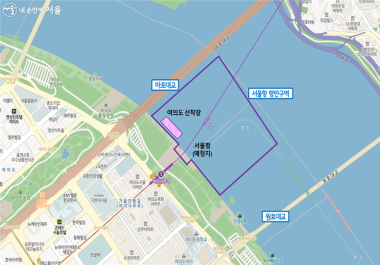 서울항 선착장의 위치는 마포대교 남단과 서울항 예정지 사이 공간으로, 다양한 규격의 선박을 동시에 정박할 수 있는 구조로 설계, 가능한 많은 선박이 활발히 왕래하도록 조성할 계획이라고 합니다.