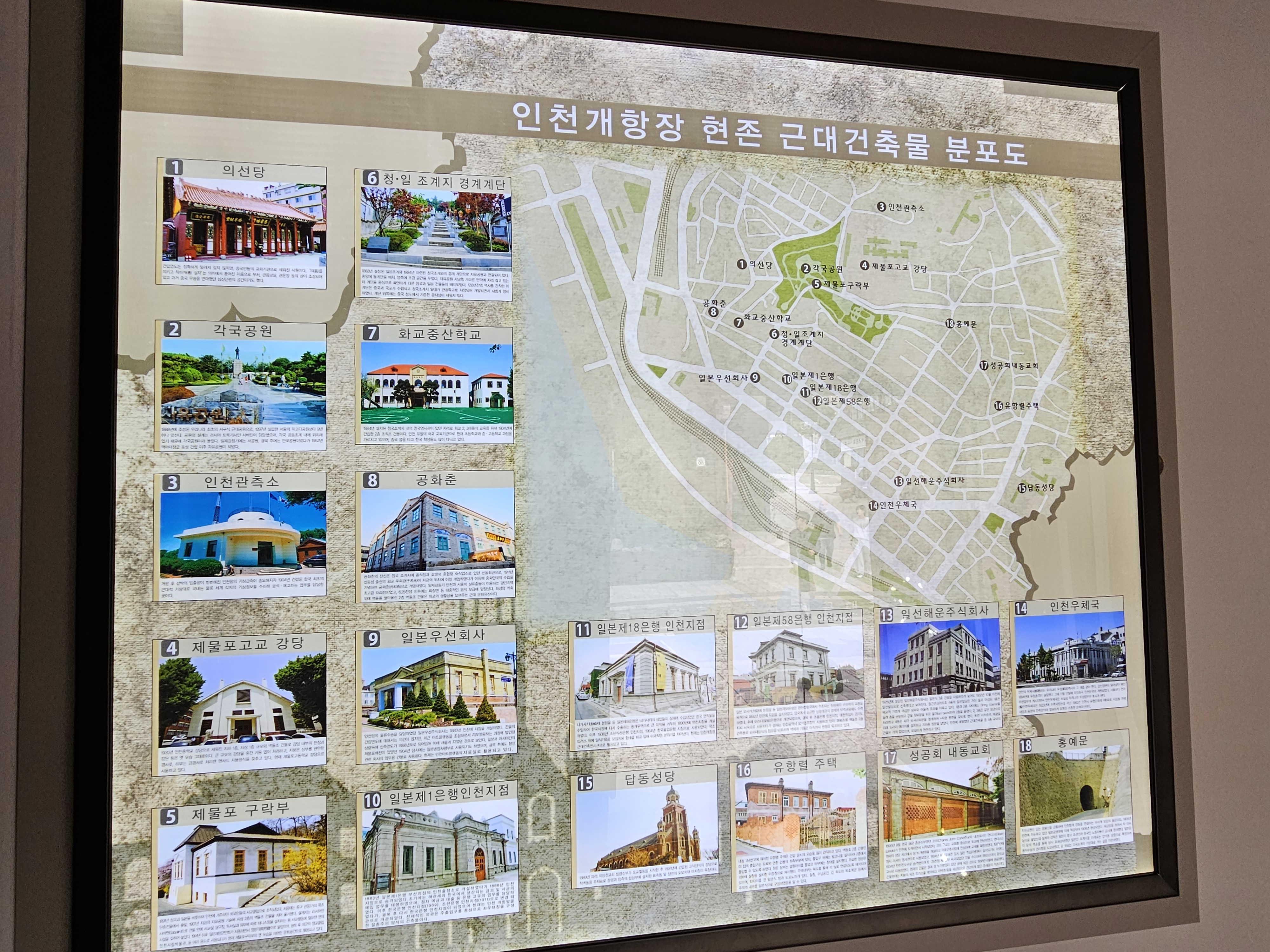 의선당, 각국공원, 인천관측소, 제물포고등학교 강당, 제물포 구락부, 청일조계지 경계계단, 화교중산학교, 공화춘, 일본우선회사, 일본 제1은행 인천지점, 일본 제18은행 인천지점(근대건축전시관), 일본 제58은행 인천지점, 익선해운주식회사, 인천우체국, 답동성당, 유항렬 주택, 성공회 내동성당, 홍예문 등