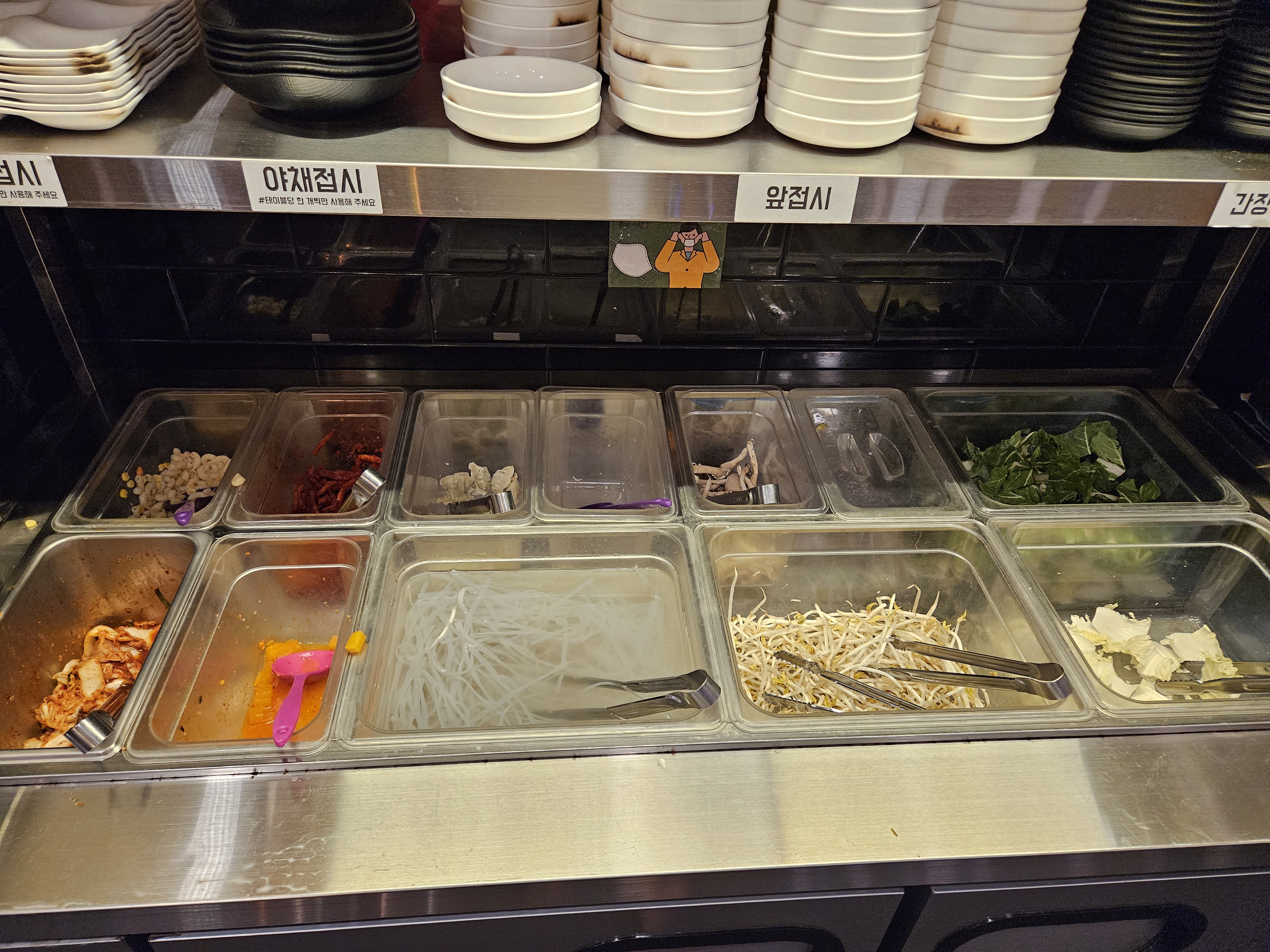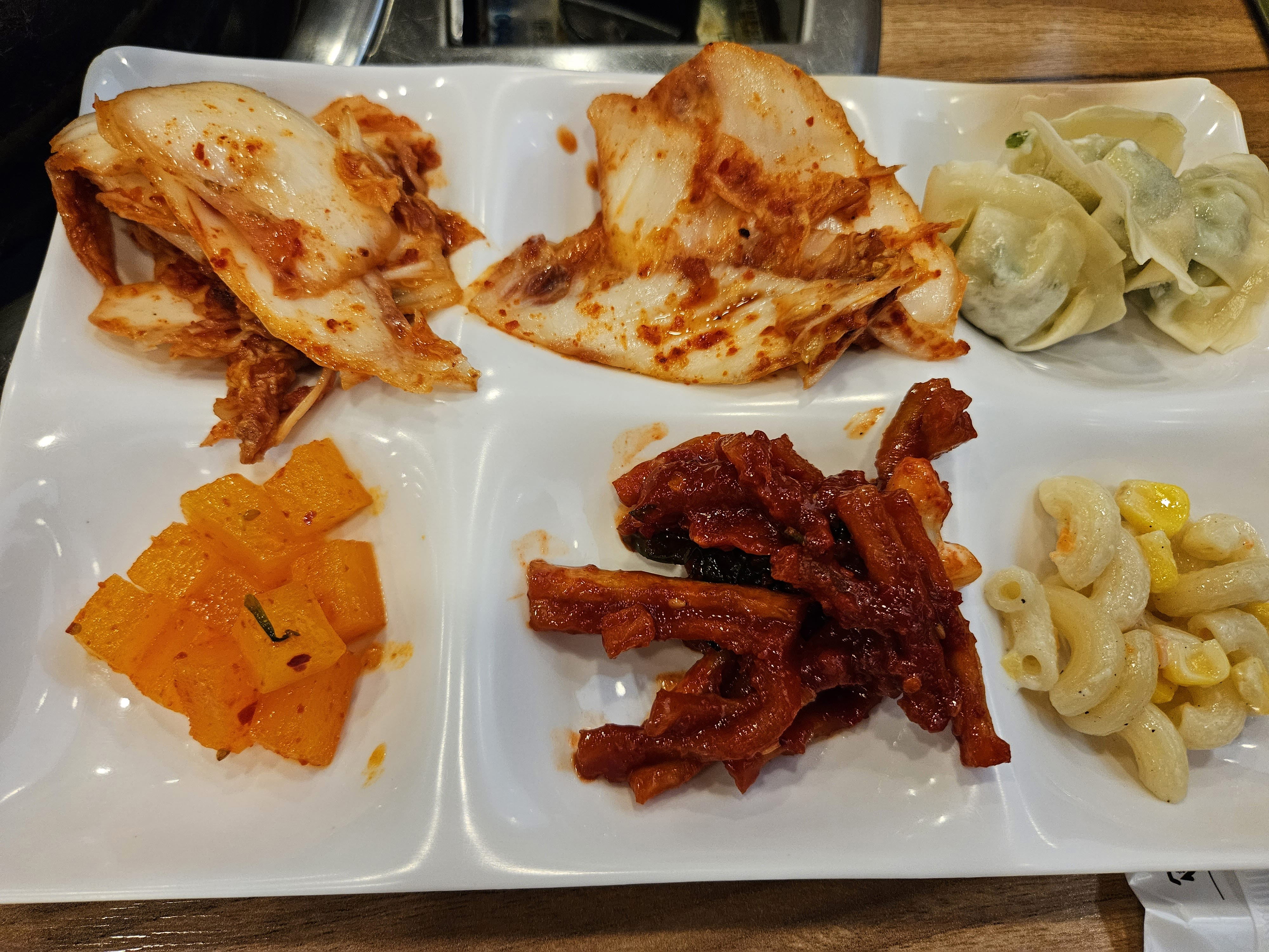 김치, 단무지, 만두, 콩나물, 면, 배추, 상추 등