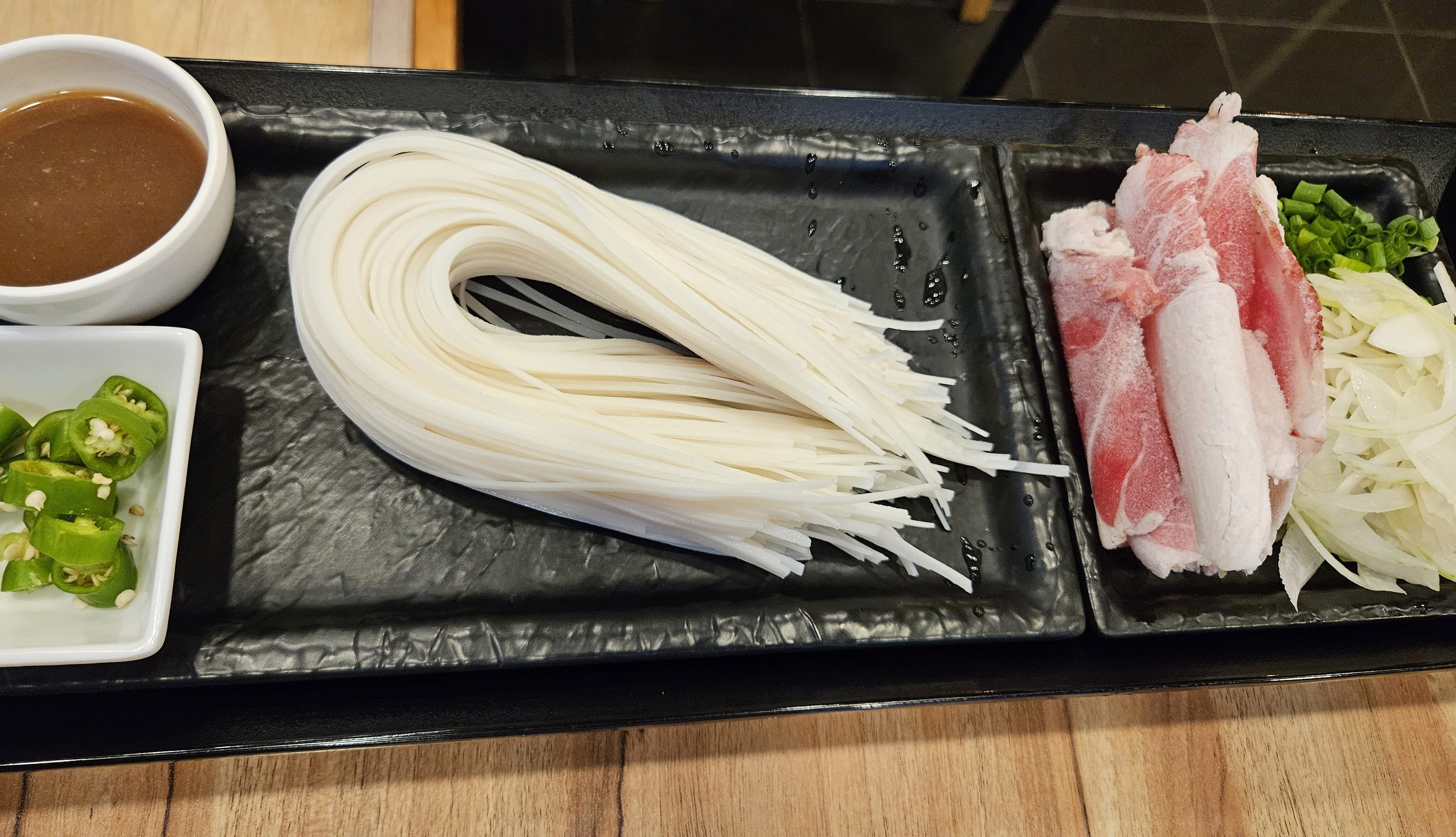 밀푀유나베를 먹고 나서 남은 육수에 넣을 쌀국수와 야채죽 재료까지 모두 나왔습니다.