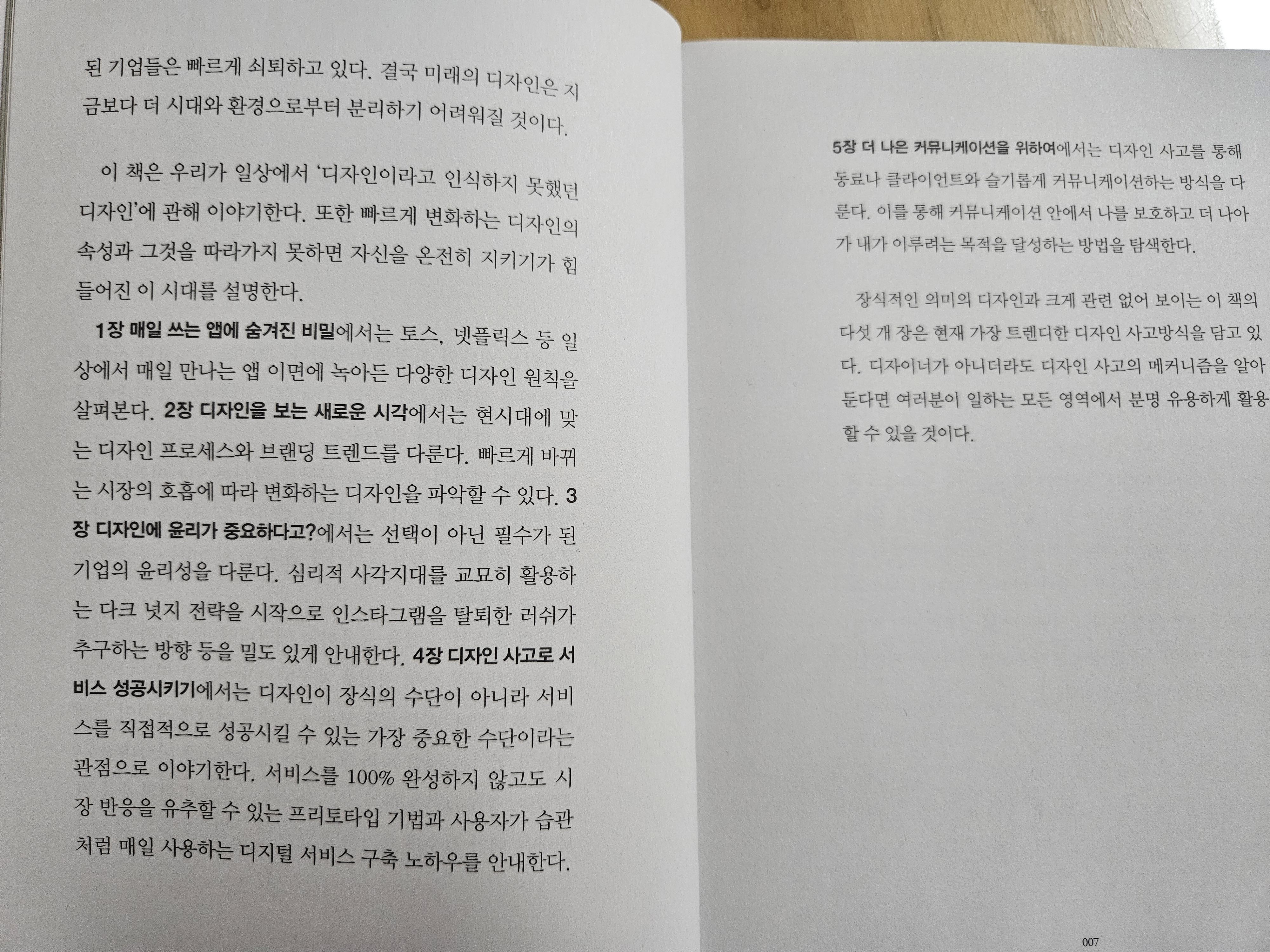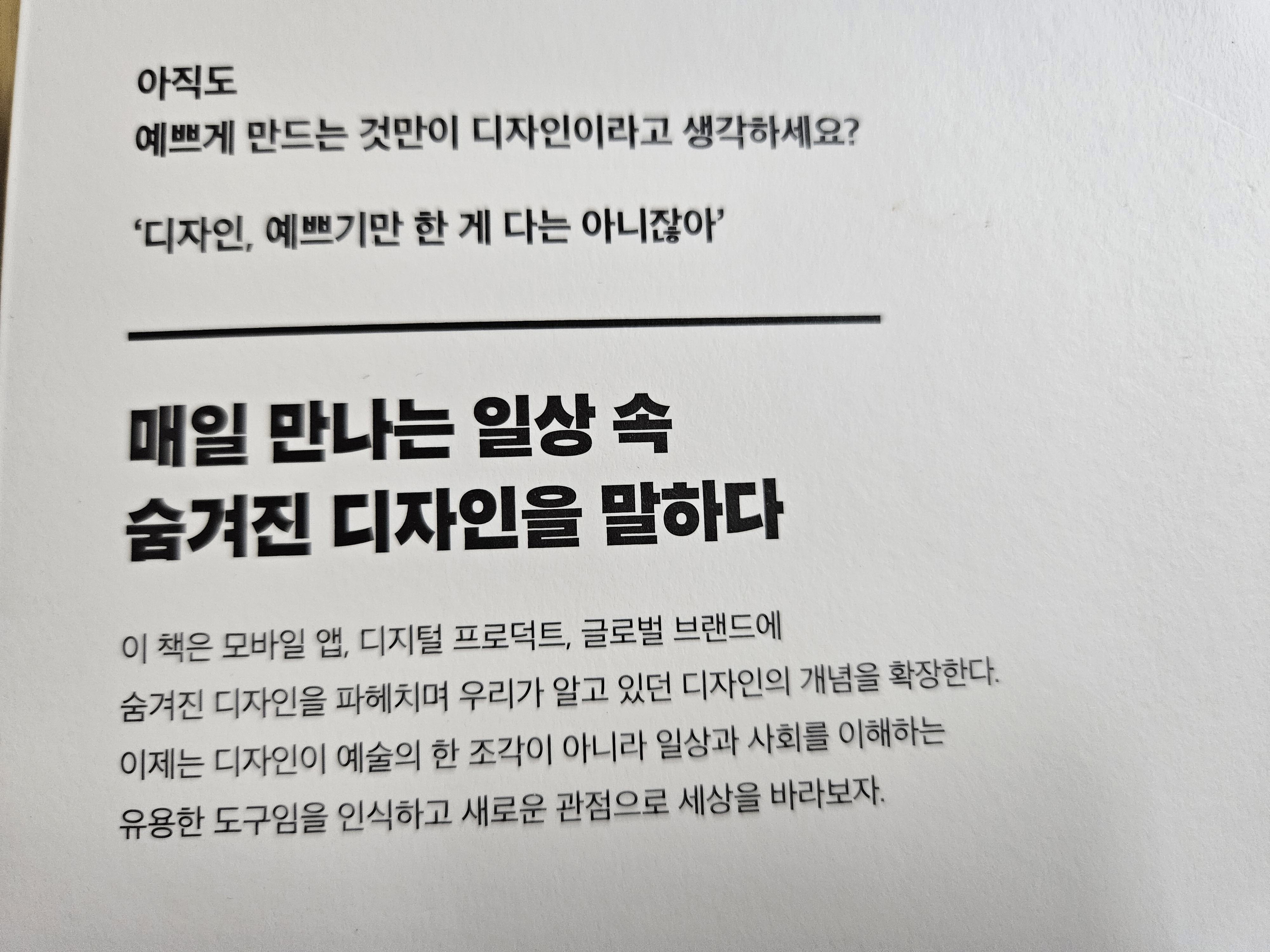 이렇듯 일상에서 자주 사용하는 엡에서의 디자인이라고 생각하지 못했던 확장된 디자인에 대한 사례를 짚어보고, 앞으로 디자인을 보는 새로운 시각에 대해서 알 수 있는 책입니다.