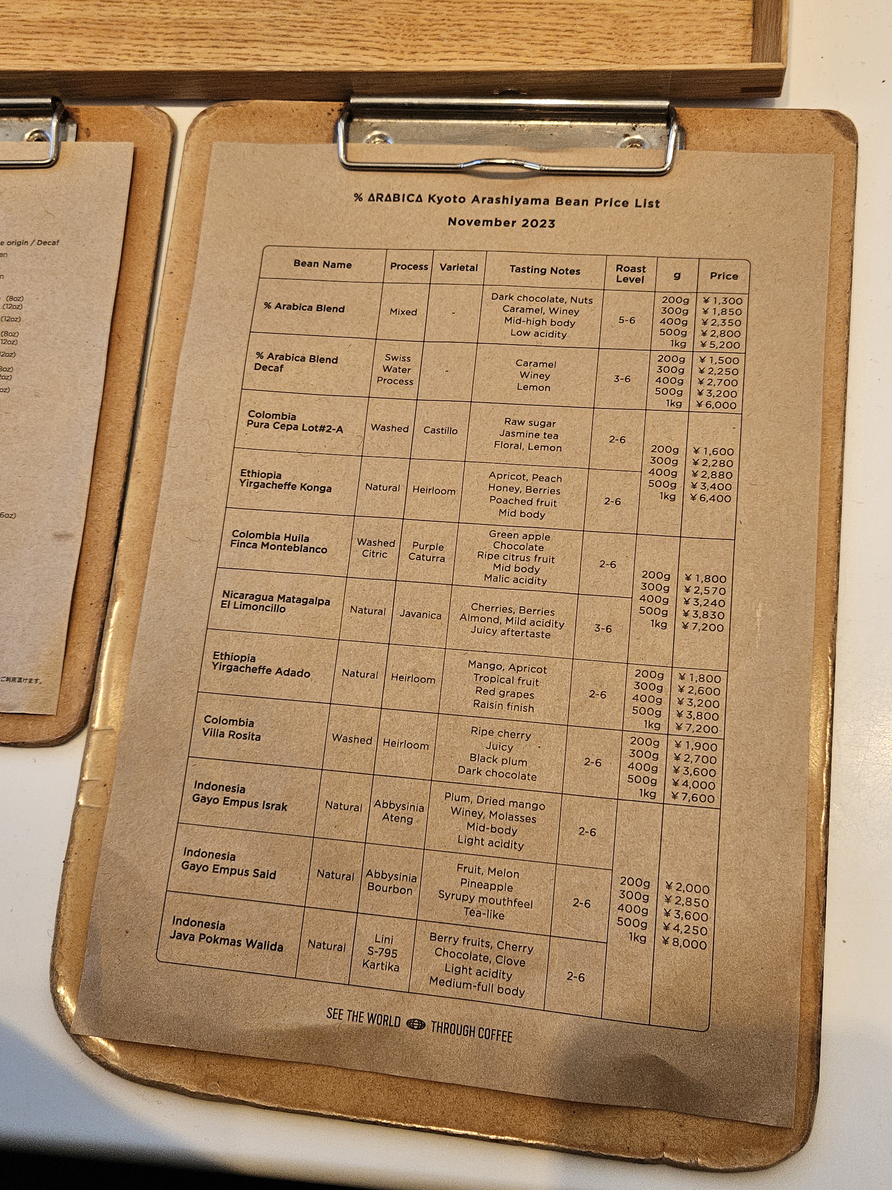 아라비카 교토 %커피는 교토 아라이야마와 히가시야마 등 세 곳의 매장이 있고, 홍콩과 중국, 프랑스 등세계 17개국에 진출해 있다고 합니다.