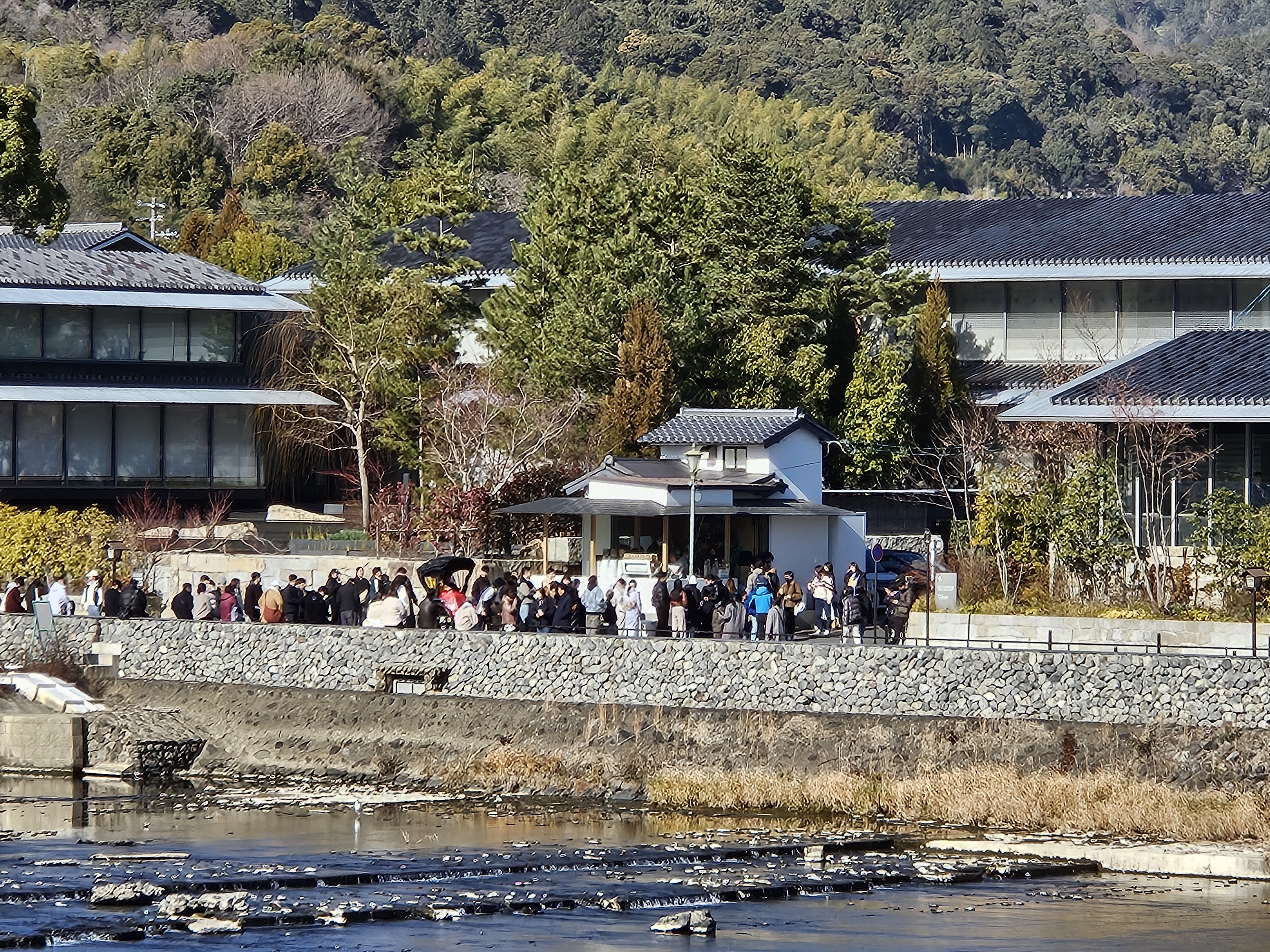 오전에 아라야시마에 도착할 때부터 점심시간이 지난 시간까지 길게 줄 서 있는 아라비카 교토의 %커피 매장 모습