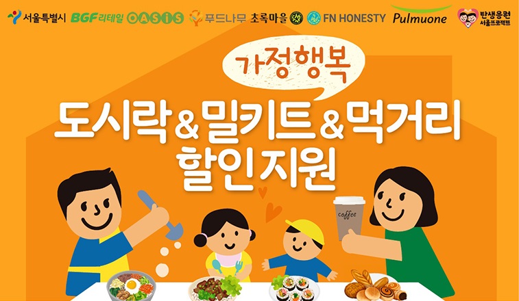 서울시 가정행복 도시락, 밀키트, 먹거리 할인지원은 저출생 대책 ‘탄생응원 서울 프로젝트’의 하나로, 18세 이하 자녀가 있는 가정에서 식사 준비에 드는 시간과 비용을 절약할 수 있도록 ‘가정행복 도시락·밀키트·먹거리 할인지원 사업’을 진행하고 있습니다.