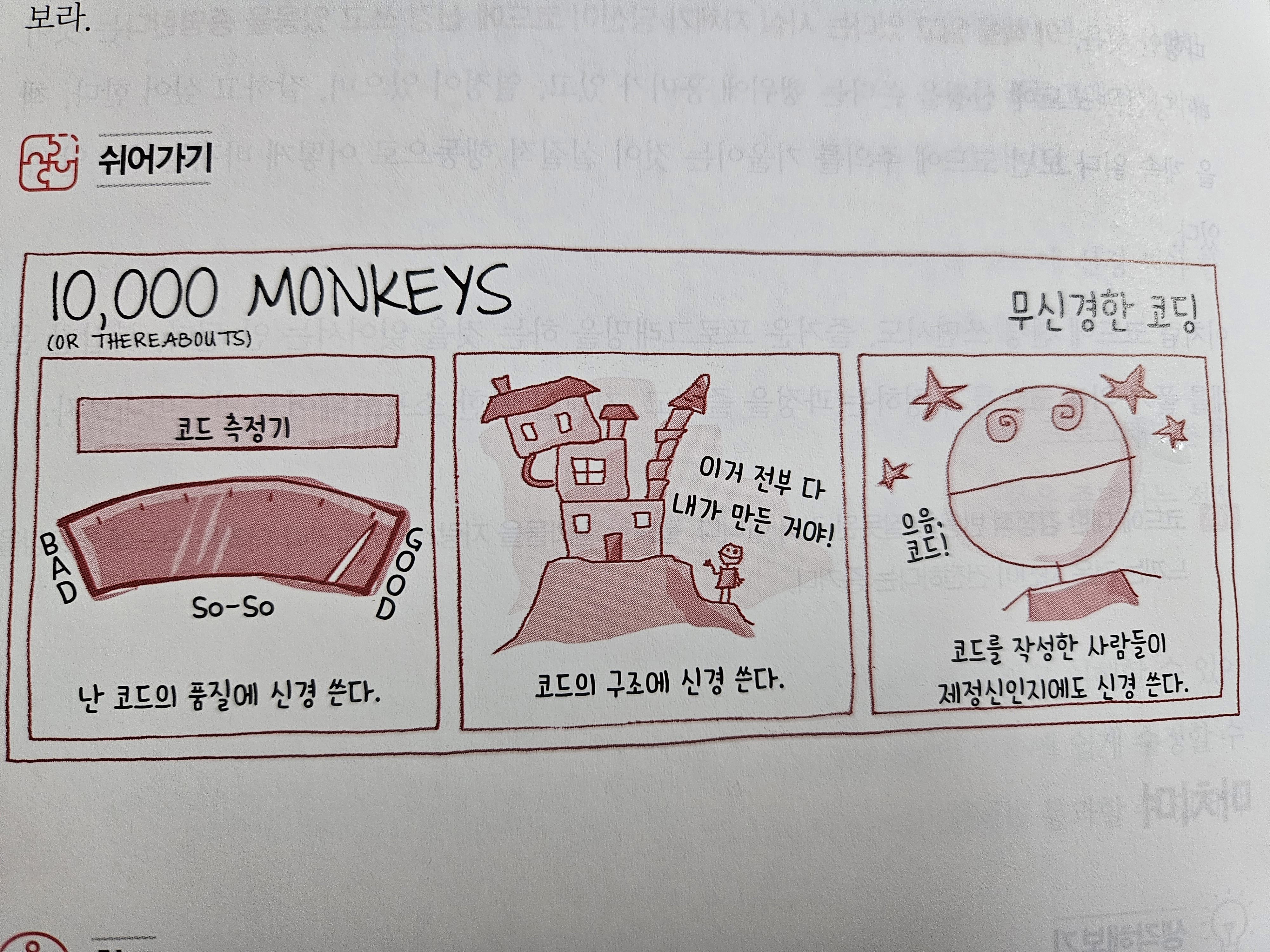 각 장마다 생각해 보기와 연습해 보기가 있어 더 나은 프로그래머가 되기 위한 핵심 포인트를 짚어 주는 내용이 있고, 쉬어가기에는 간단한 만화를 통해 각 장의 핵심을 묘사하고 있습니다.