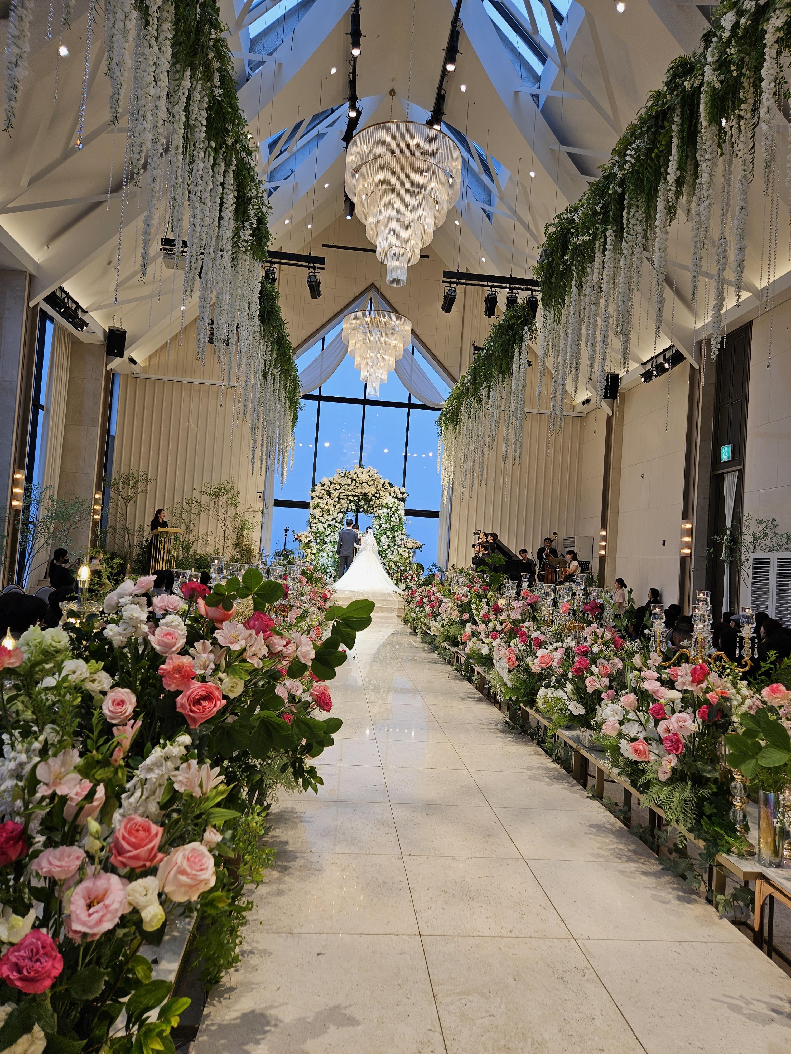예식홀이 크진 않지만 단독홀로 꼭대기층에 자리하고, 층고가 무척 높아 개방감이 무척 좋더군요.