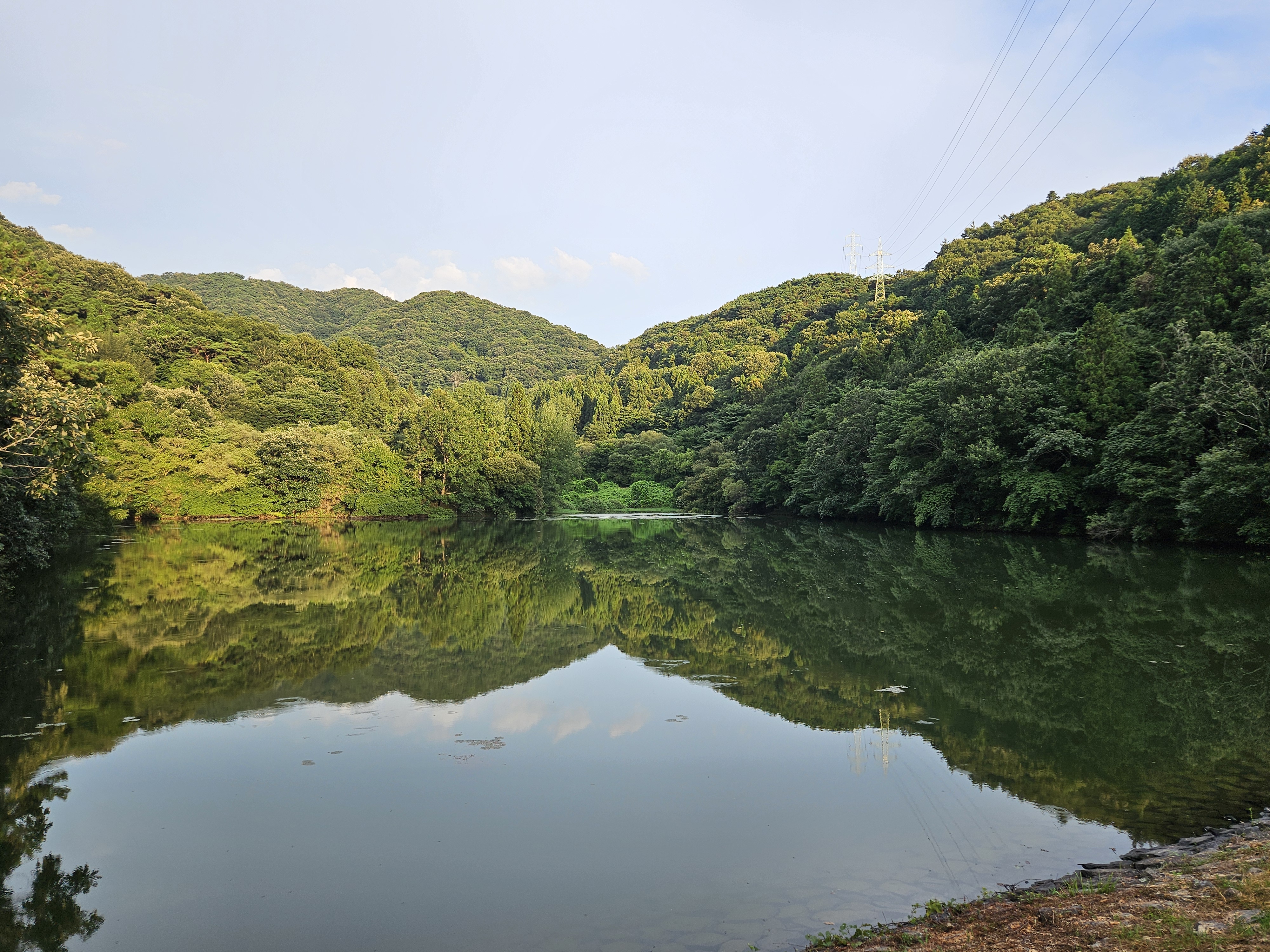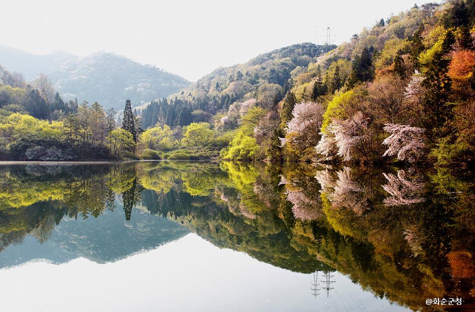 이른 아침 물안개가 피어오르고 햇살이 비추기 시작하면 잔잔한 호수에 비친 산벚꽃과 초록의 나무들이 수면 위에 거울에 비추듯 그대로 투영되어 이국적이면서도 몽환적인 분위기를 연출하는 곳입니다.