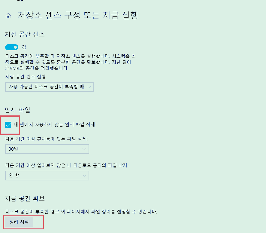 저장소 센스를 [켬]으로 설정