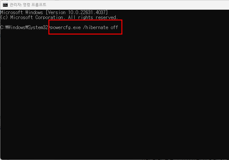 명령 [powercfg.exe /hibernate off]를 입력하고 Enter 키를 눌러 실행하면 휴식 상태가 꺼지고 숨김 파일 ”hiberfil.sys“가 삭제됩니다.