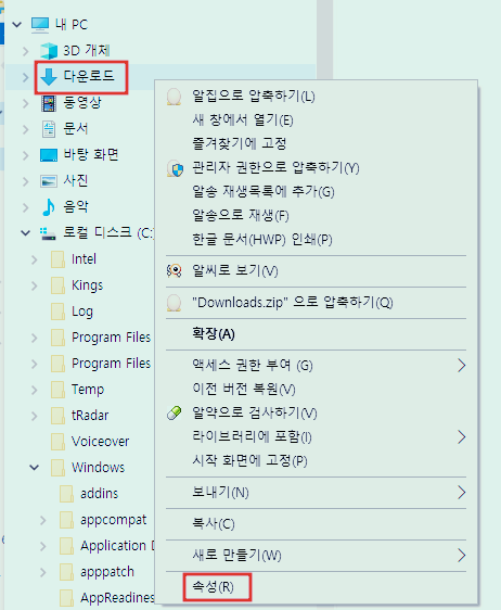 탐색기에서 [다운로드] 폴더에서 마우스 오른쪽 버튼 클릭 - [속성] 선택