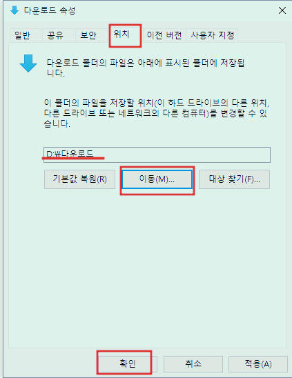 [위치] 탭 -[이동]을 선택해서 D:\다운로드를 지정해 주면 됩니다.