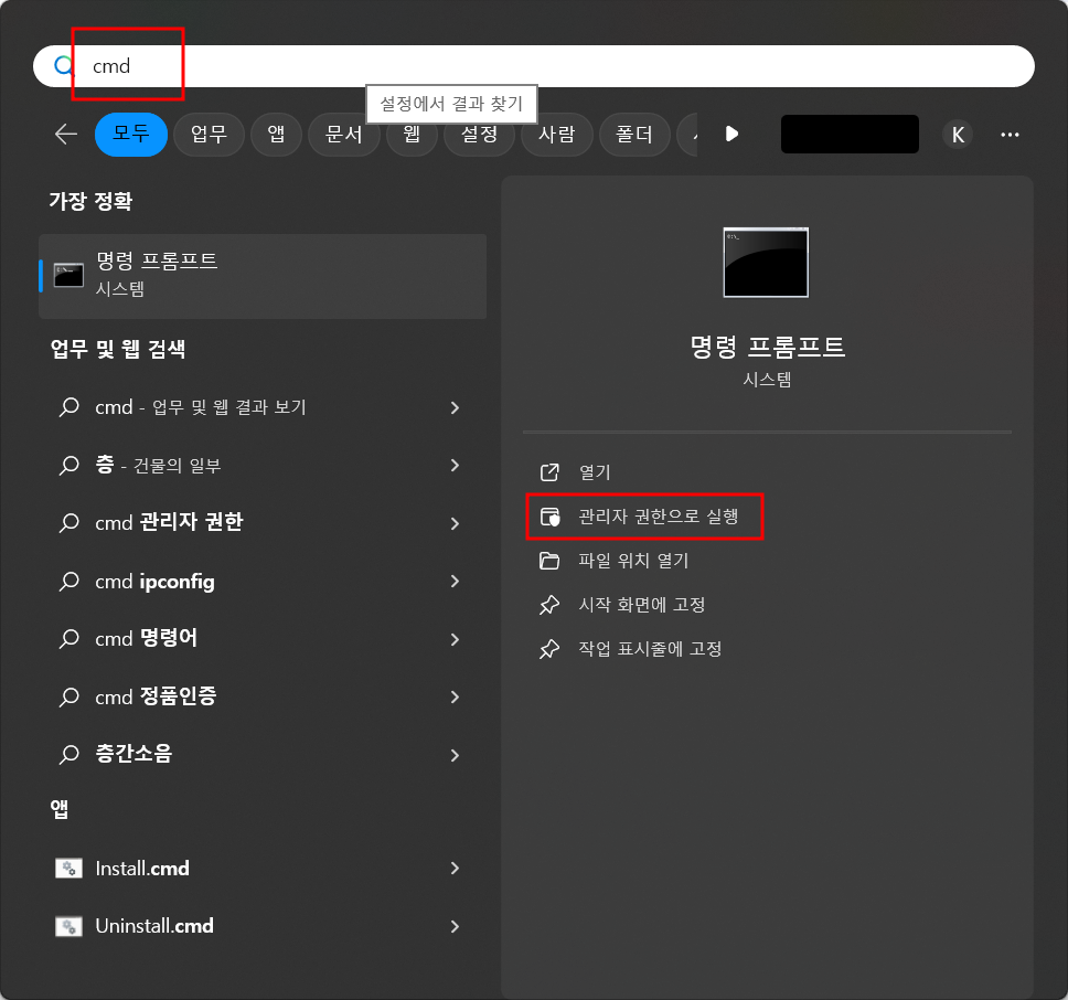 검색 상자에 [cmd]라고 입력 - [명령 프롬프트]를 오른쪽 클릭하고 [관리자로서 실행]을 선택