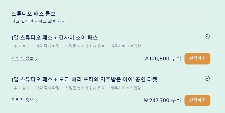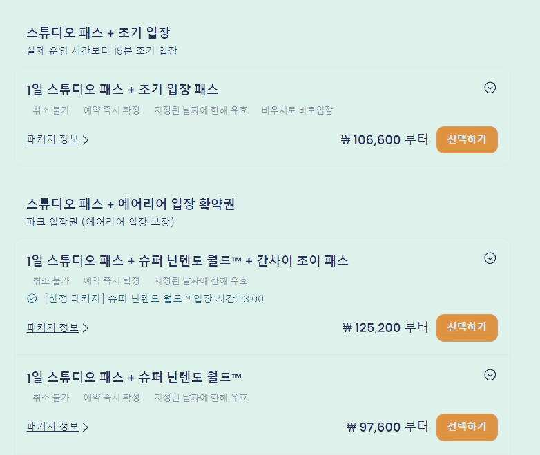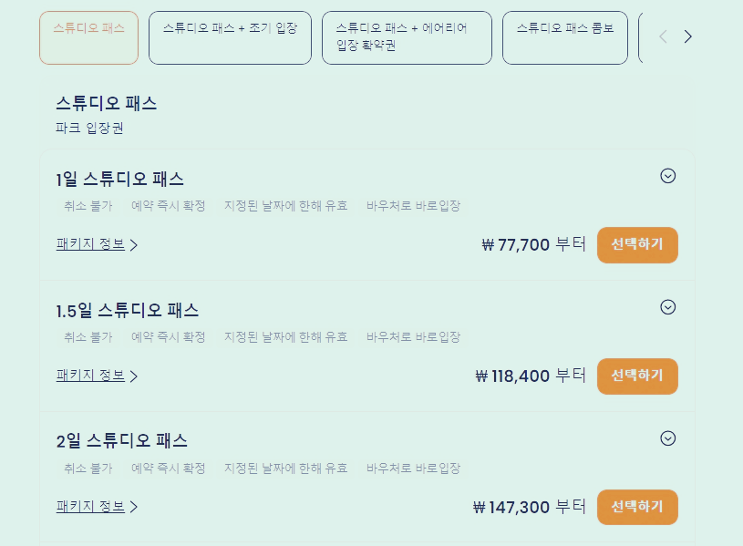 1일 스튜디오 패스와 1.5일 스튜디오 패스, 2일 스튜디오 패스 등이 있고, 특정날짜에 따라 1일 스튜디오 패스+조기입장 패스, 스튜디오 패스+에어리아 입장 확약권이 있습니다.