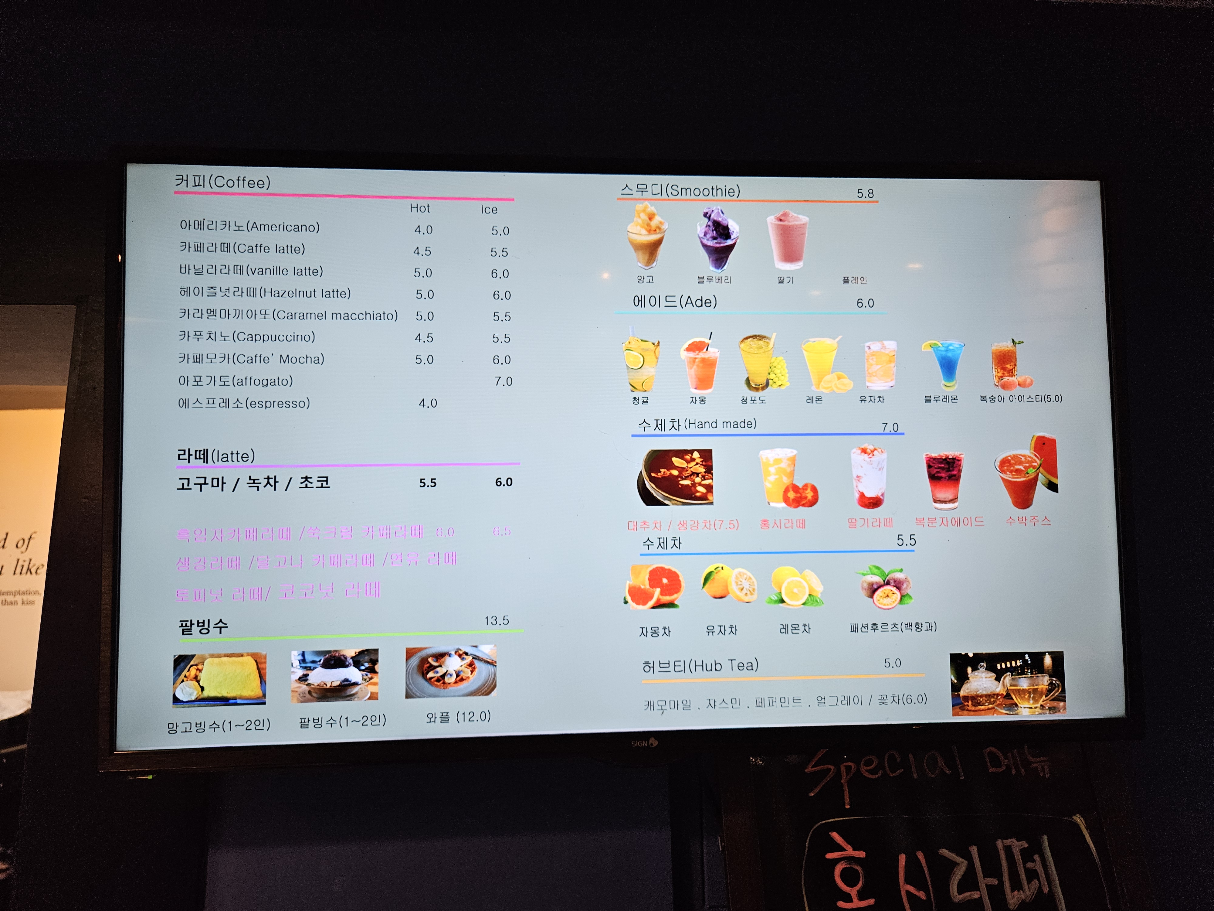 팥빙수 13,5600ㅇ둰, 고구마와 녹차/초코라떼 5,500~6,000원