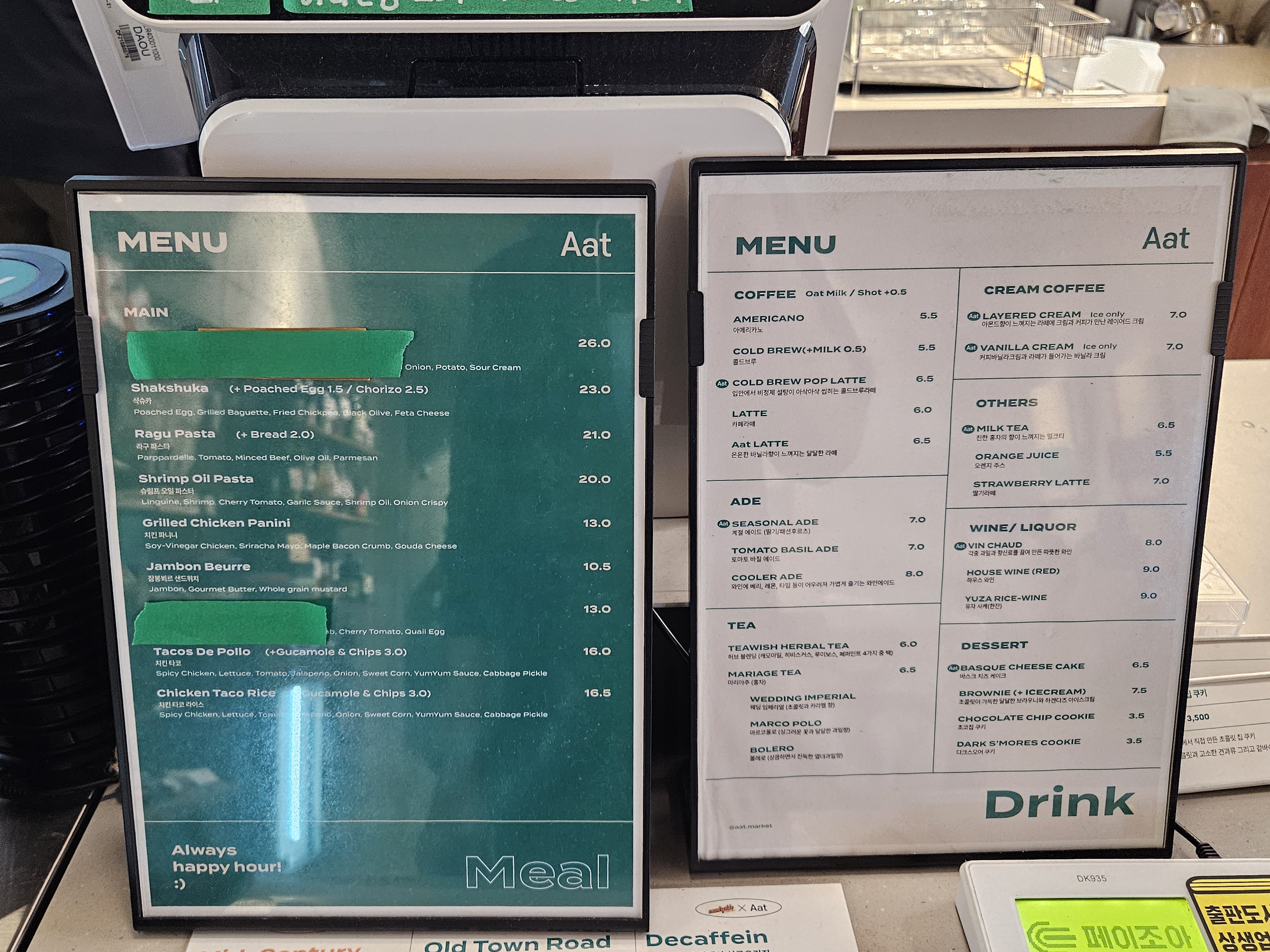 아메리카노 5,500원, 콜드브루 5,500원, 라떼 6,000원, aat 라떼 6,500원