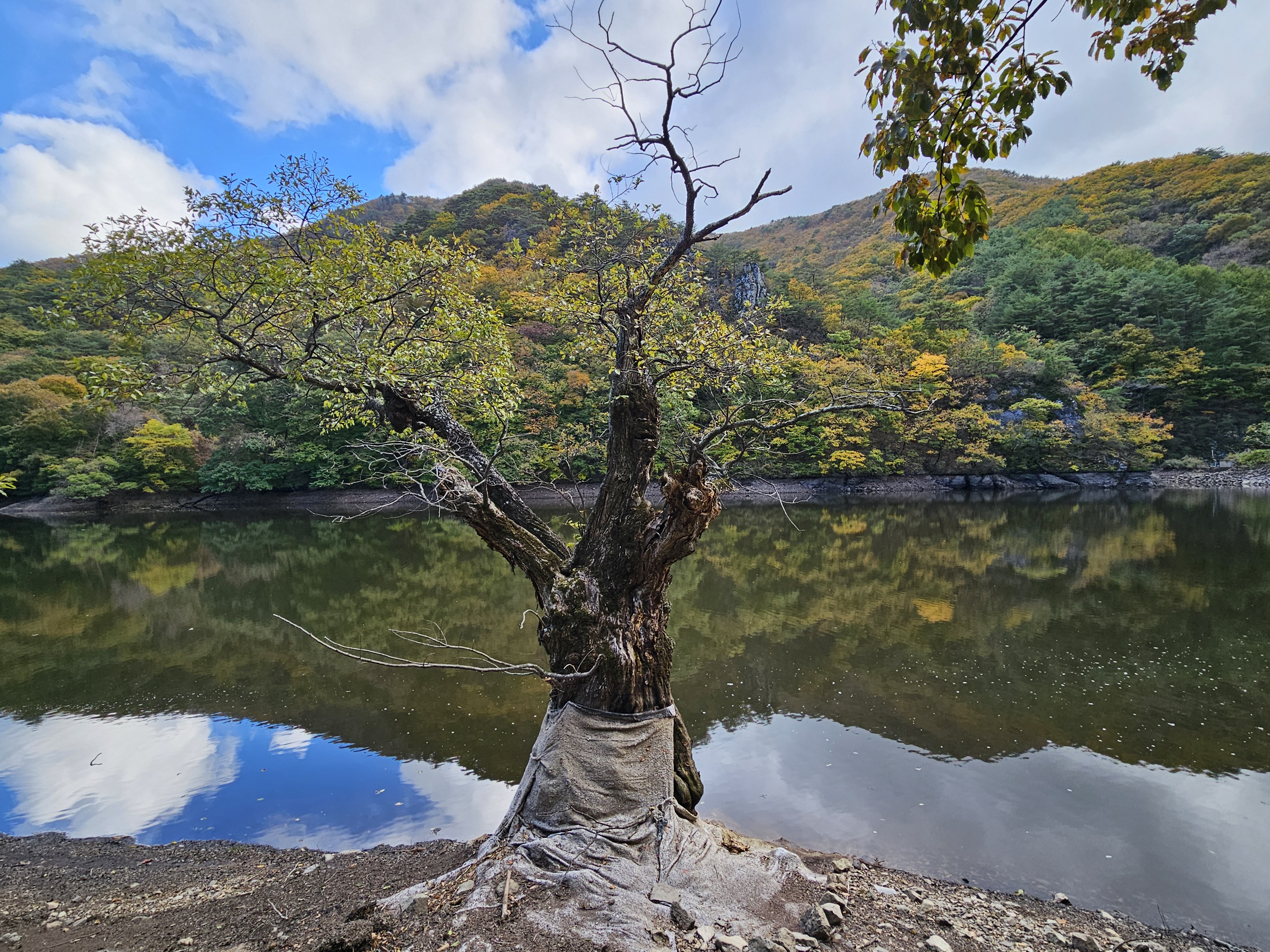 왼쪽 사진처럼 아름다운 주산지 풍경을 보기 위해 갔지만, 실상은 우측 사진처럼 물이 제법 빠지고 왕버들이 뭍에 드러나고 죽어가는 모습을 보니 다소 아쉬웠던 곳이었습니다.