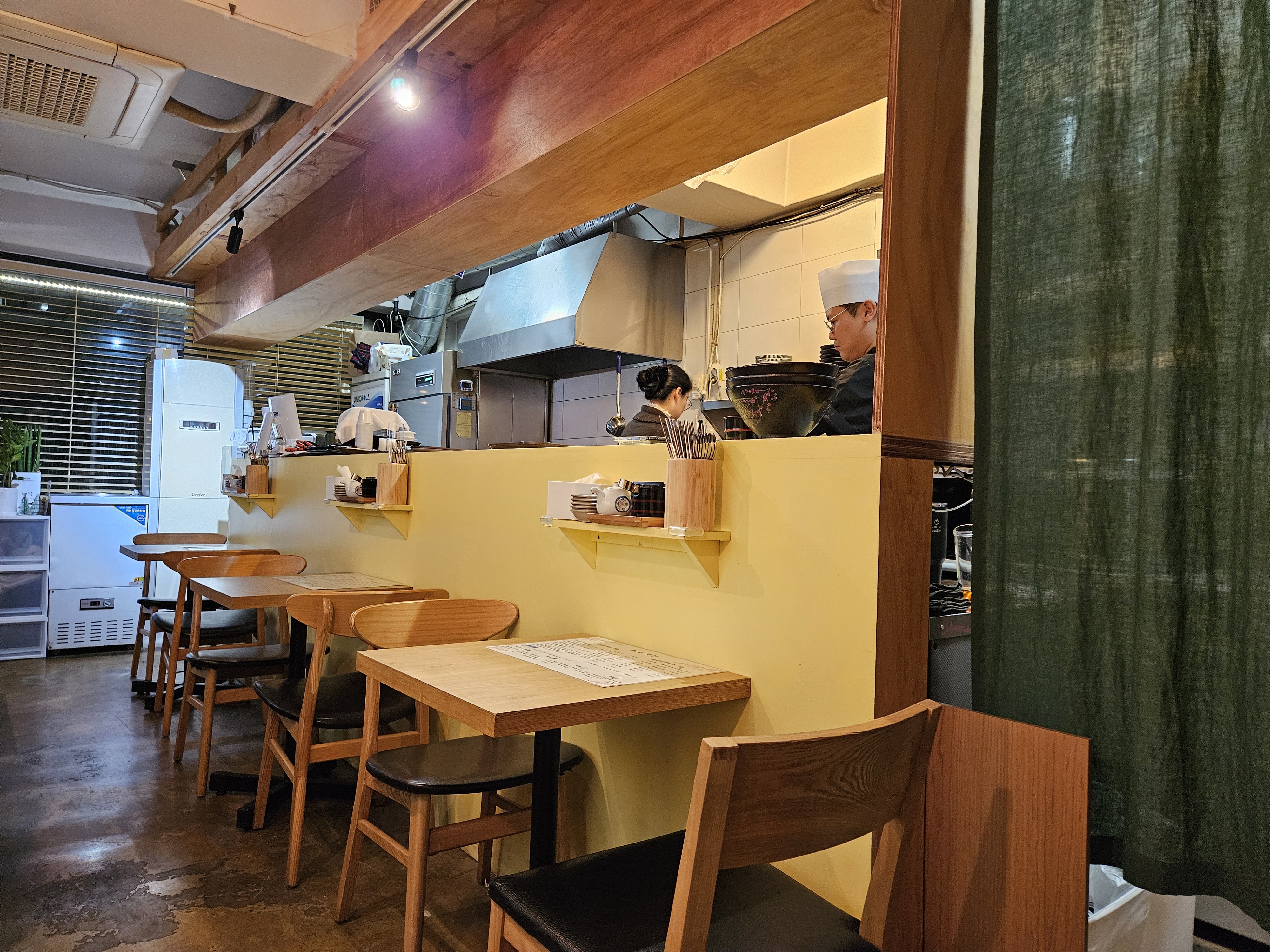 2인 테이블이 4개, 4인 테이블이 4개 있는데 4인테이블에 손님들이 있어서 2인 테이블하고 주방 모습만 살짝~