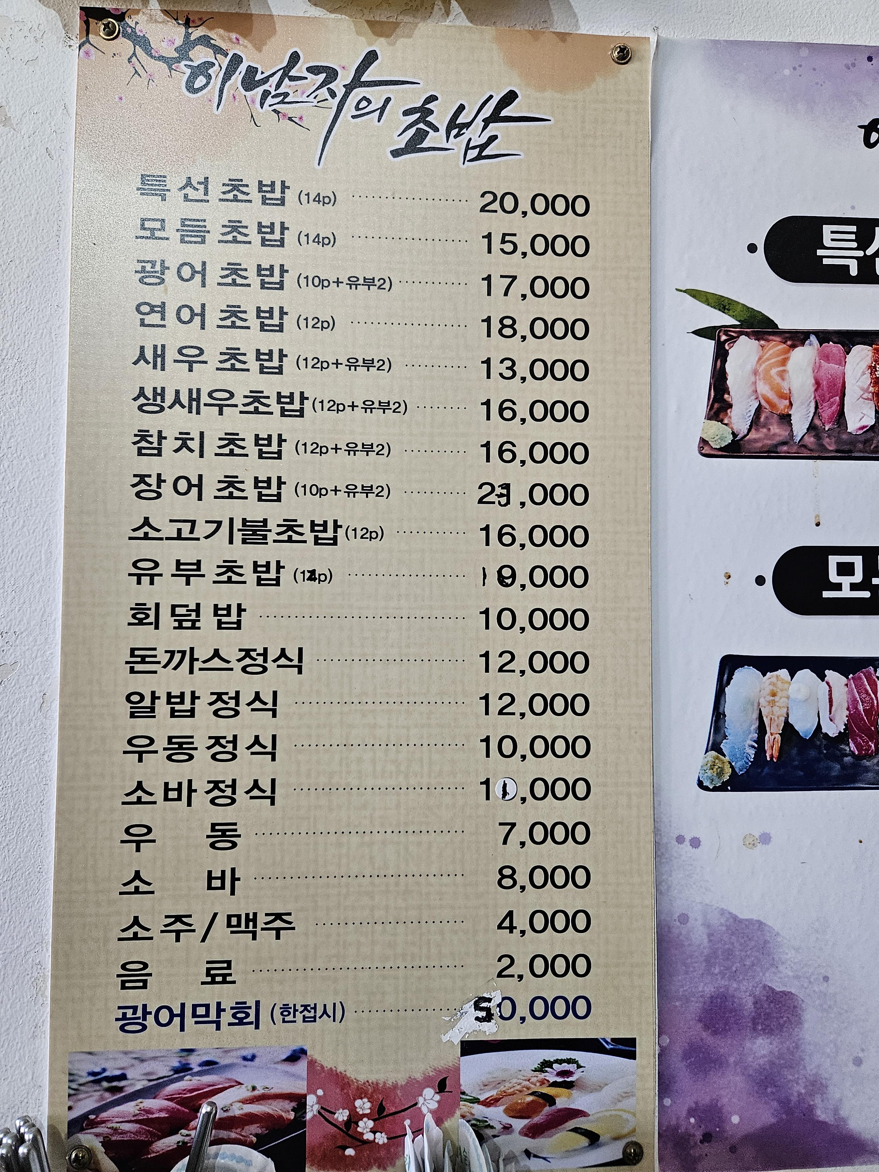 특선초밥, 모듬초법, 광어초밥, 연어초밥, 새우초밥, 생새우초밥, 참치초밥, 장어초밥, 소고기불초밥, 유부초밥 등 초밥 전문점답게 메뉴구성이 되어 있고요.