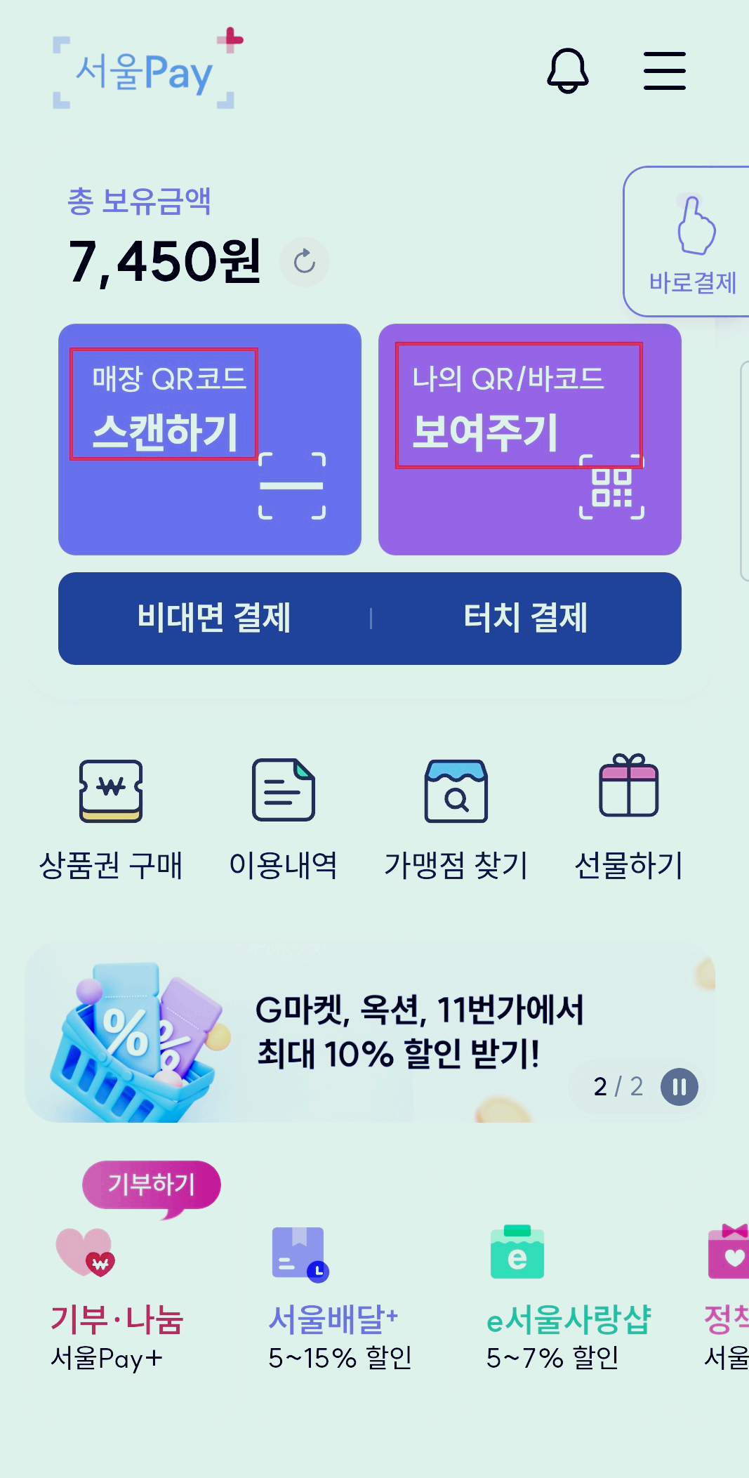 상단에 있는 '매장 QR코드 스캔하기'와 '나의 QR/바코드 보여주기' 등을 통해 결제할 수 있습니다.