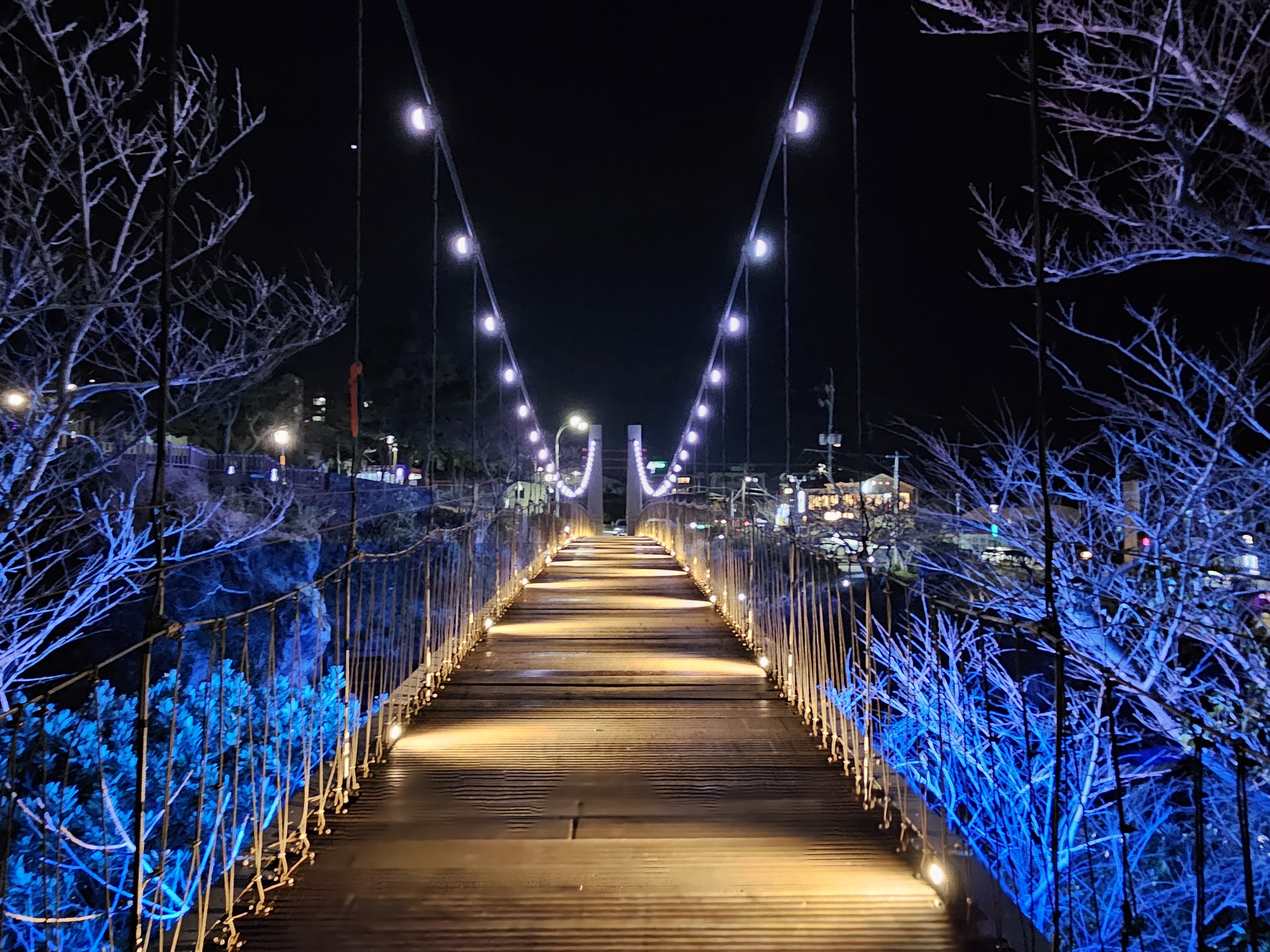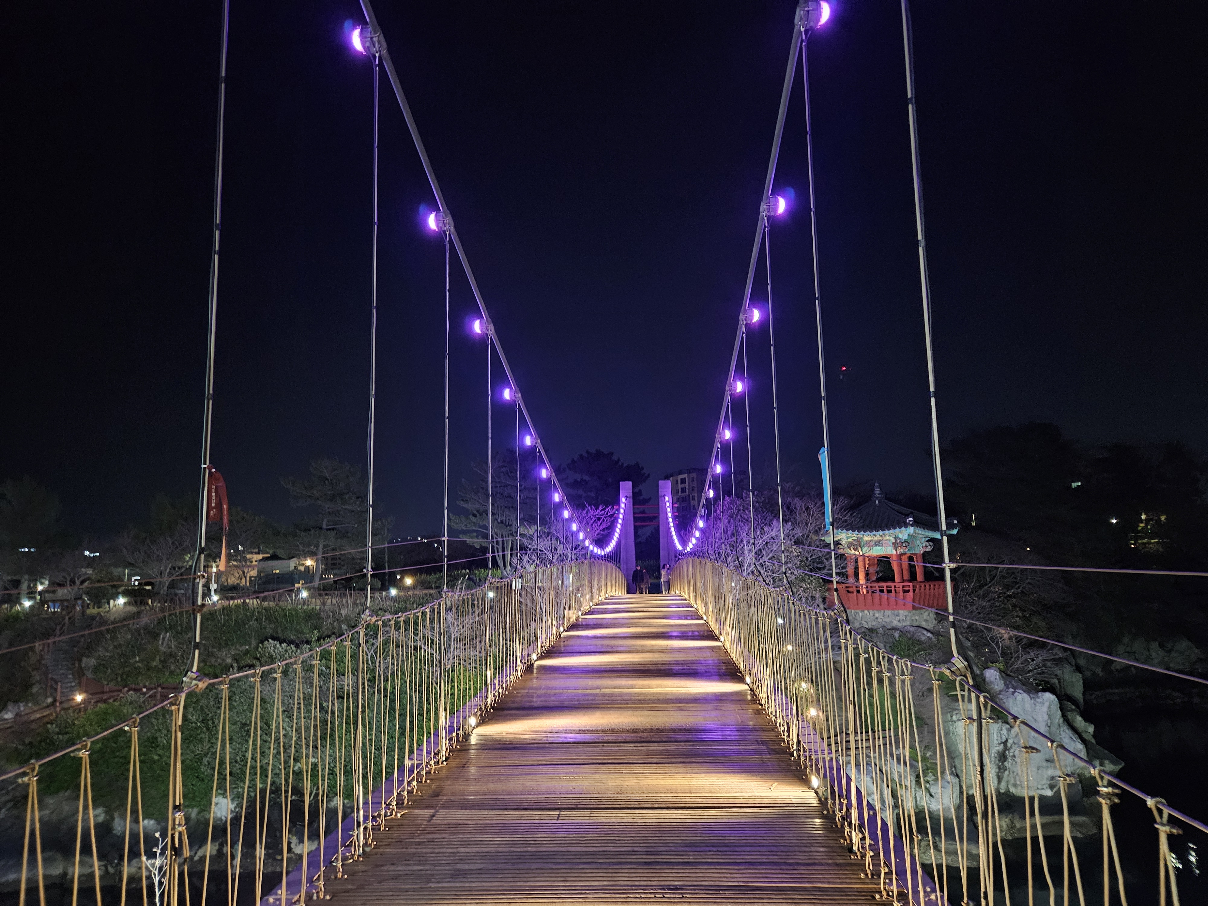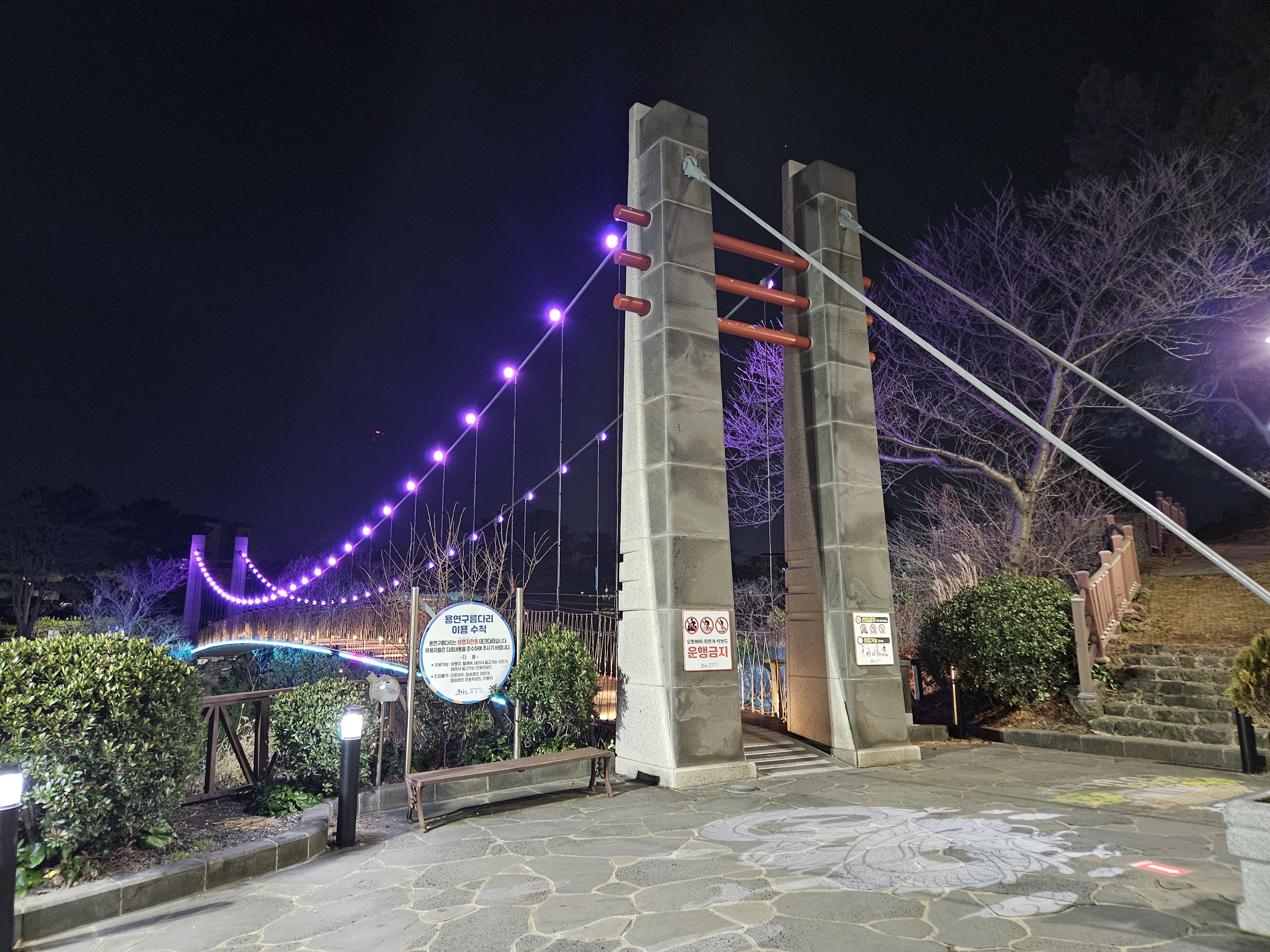추우니까 시내와 가깝고 많이 걷지 않아도 아름다운 야경을 볼 수 있는 명소라고 하면 용연 구름다리가 아닌가 싶습니다.