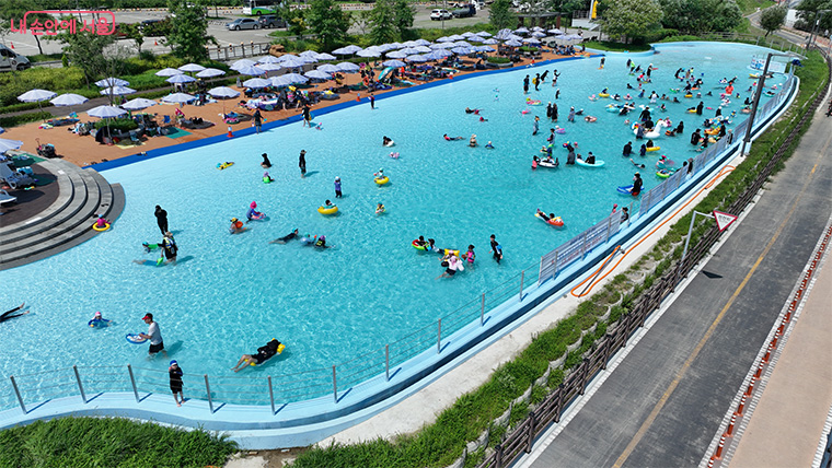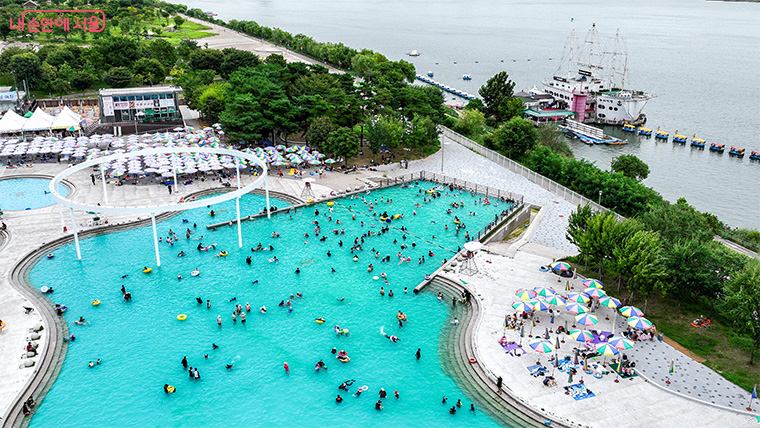 뚝섬한강공원 수영장은 흐르는 물에 튜브를 타고 도는 유수풀과 시원한 물줄기가 쏟아지는 4m 높이의 아쿠아링, 일광욕을 즐길 수 있는 썬텐장이 설치돼 있는데요.