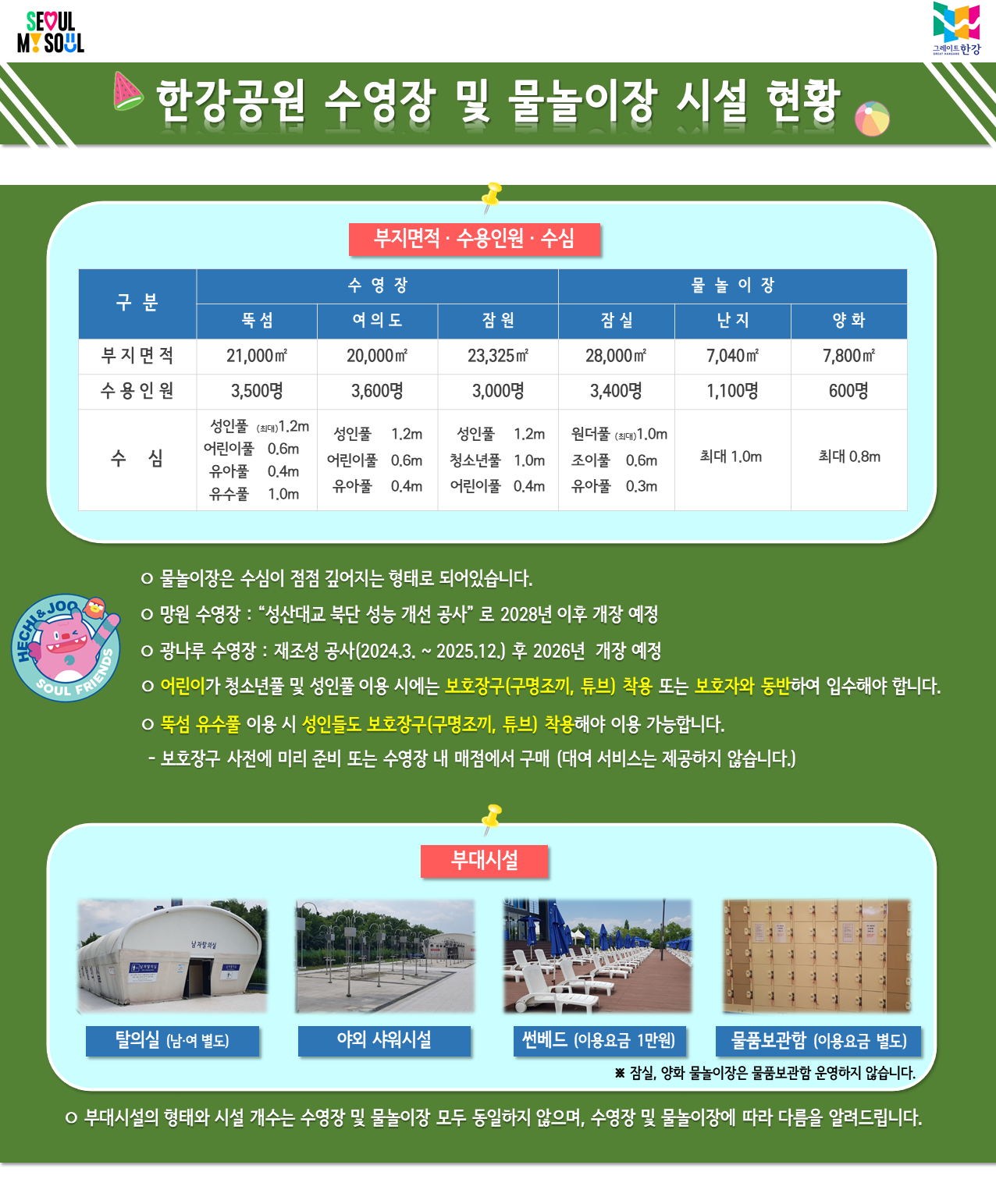 뚝섬한강공원, 여의도한강공원, 잠원한강공원의 야외 수영장과 잠실한강공원, 양화한강공원, 난지한강공원의 물놀이장 등입니다.