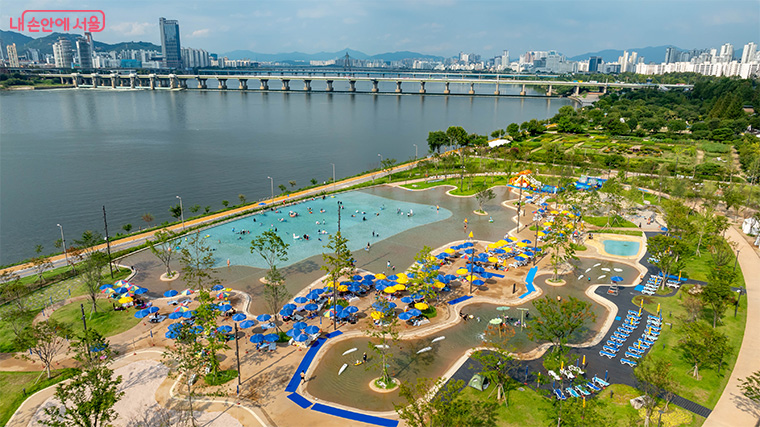 여의도한강공원 수영장은 시원한 물줄기가 쏟아지는 아쿠아링, 썬텐장 등 다양한 시설이 설치돼 있어 워터파크 못지않은 환경을 자랑하는 수영장입니다.