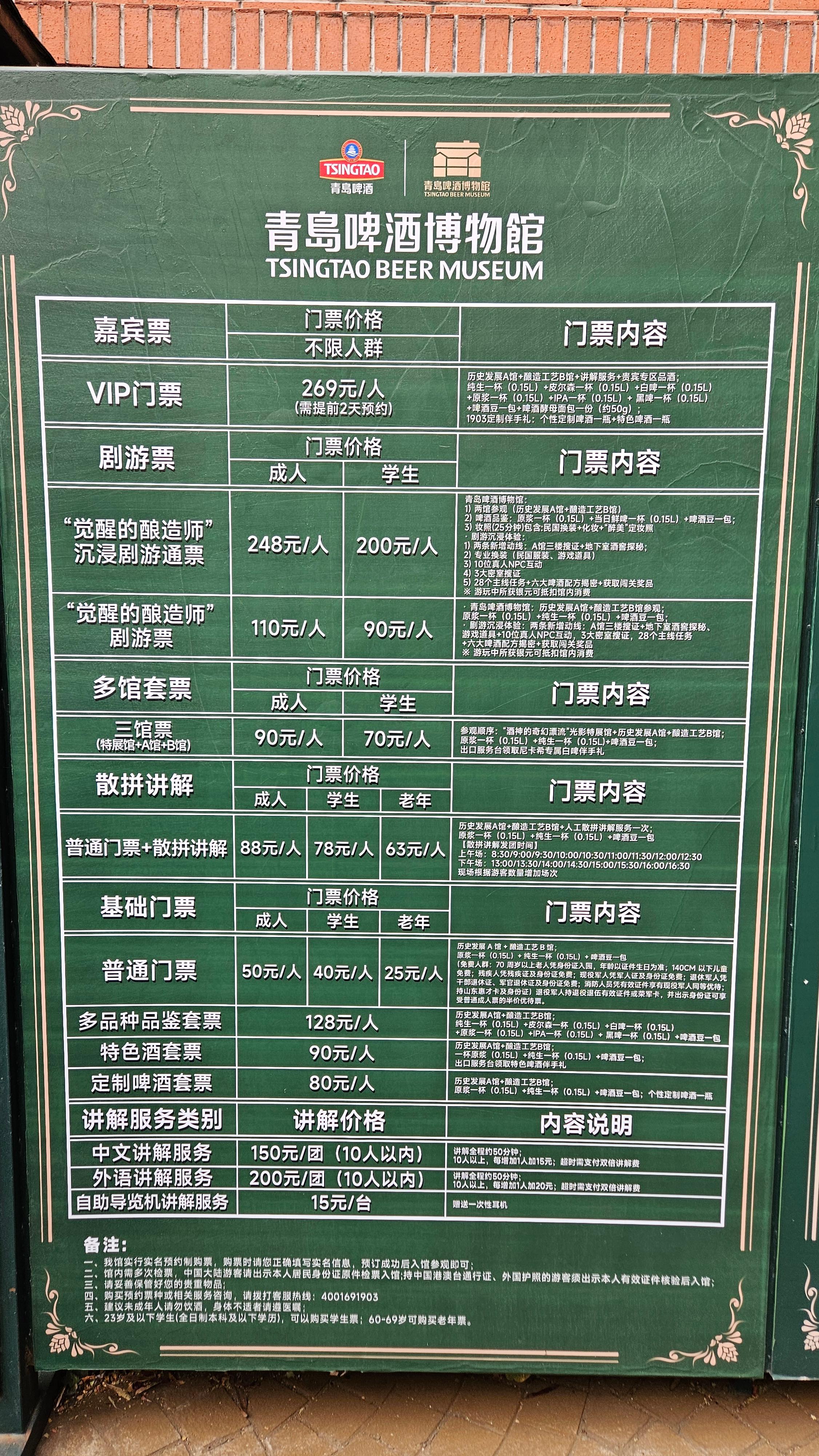 칭다오 맥주박물관 입장료 안내