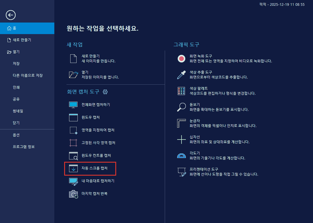 아래쪽에 [자동 스크롤 캡처]를 선택합니다.