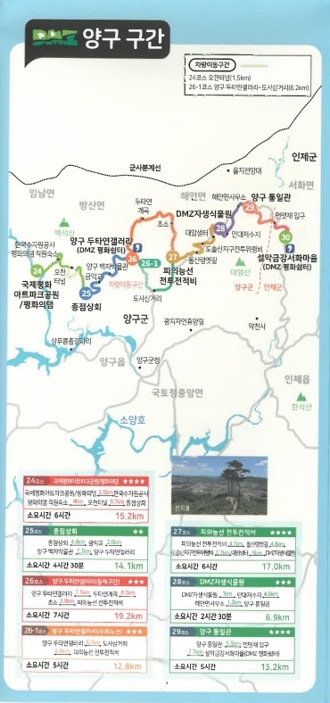 DMZ 평화의 길 26-1코스(우회로) : 길이 12.7km, 소요시간 4시간 30분, 난이도 보통