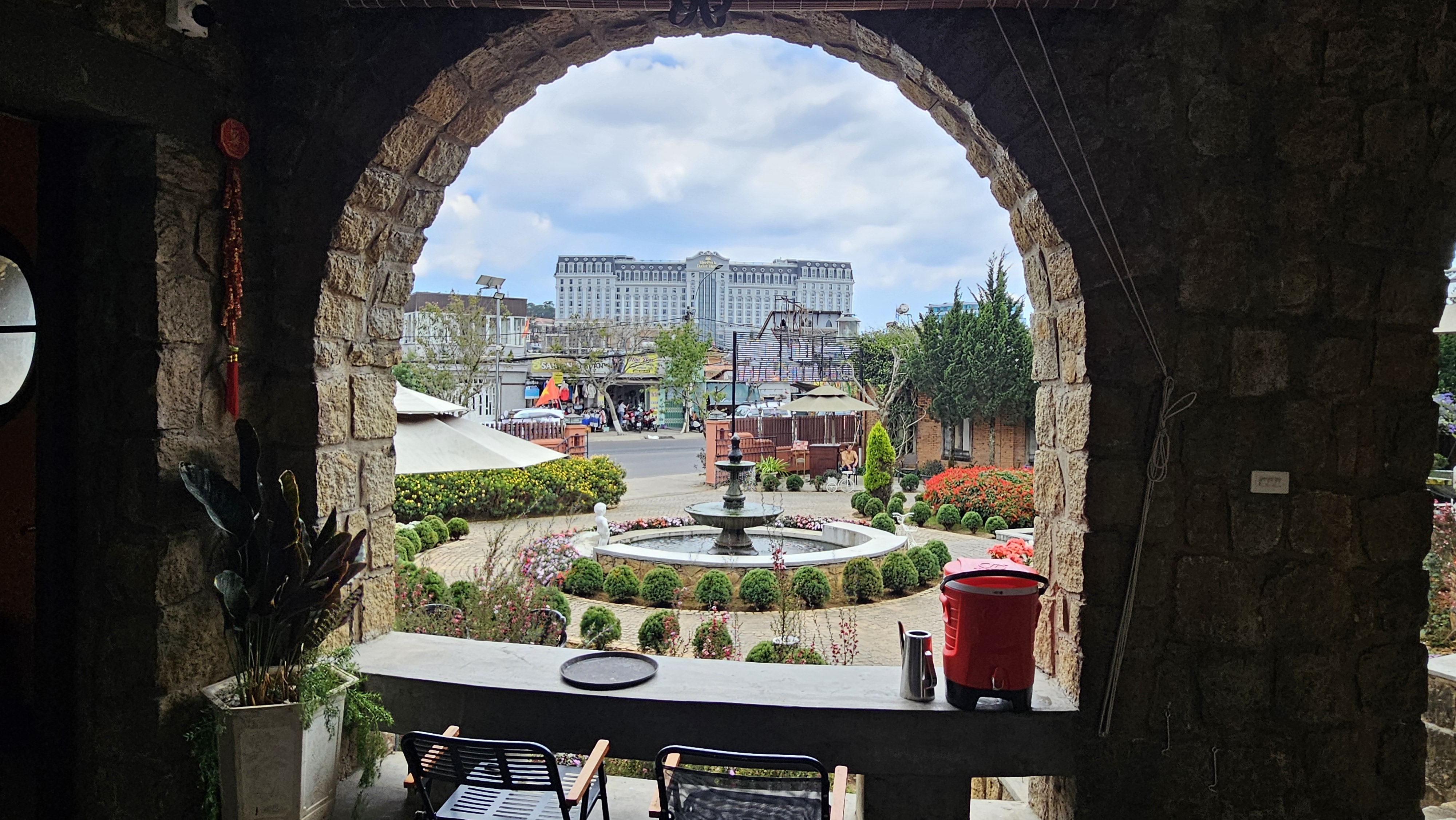 창문이 없는 아치형 창문에는 달랏의 풍경이 보입니다.