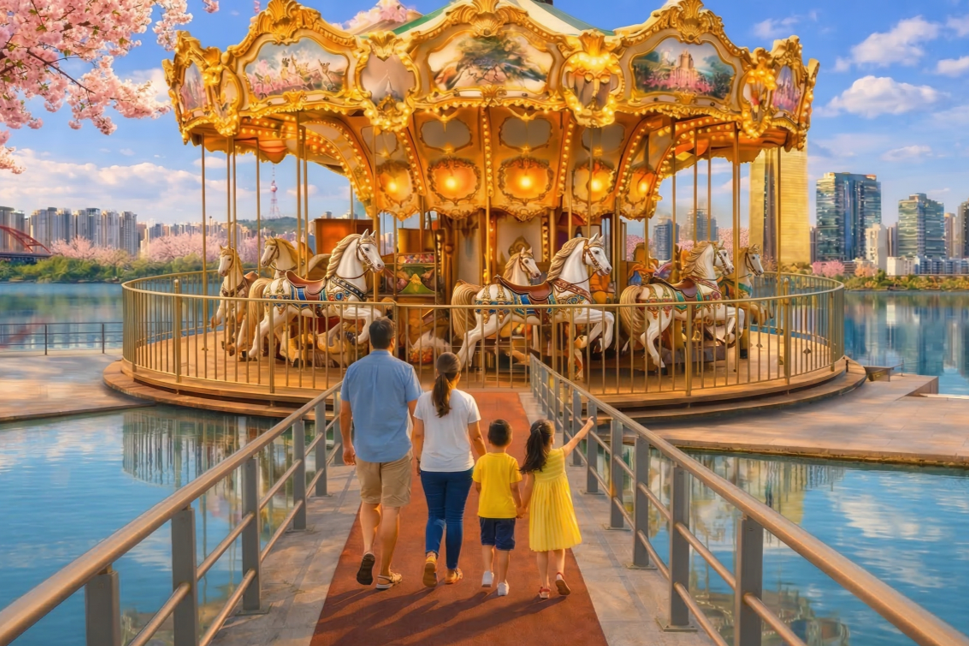 여의도한강공원 물빛광장 앞 한강에서 회전목마에 올라 천천히 흐르는 서울의 봄을 느껴보세요.