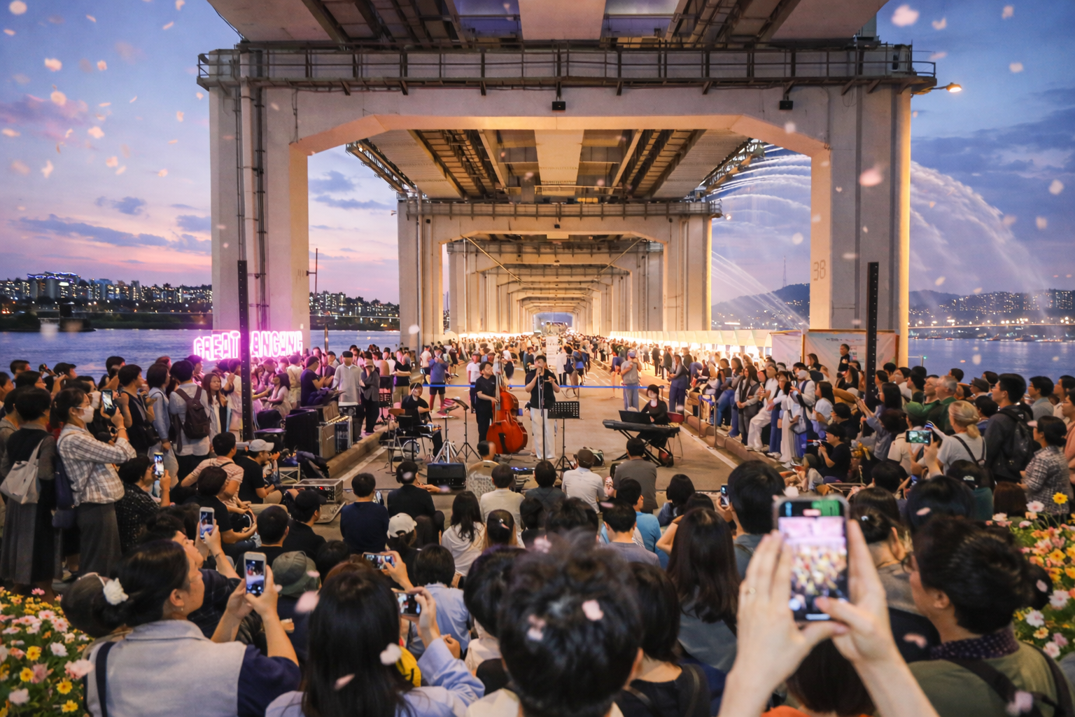 인공폭포를 활용한 미디어 연출과 시민 참여 퍼포먼스, 장르 융합 협업 무대, K-POP 레전드 아티스트 미니콘서트, 피날레 불꽃쇼까지 펼쳐집니다.