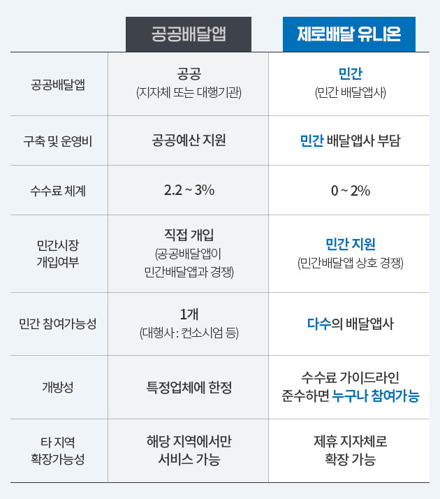 공공배달앱과 제로배달 유니온의 차이점을 비교 분석한 표인데요.