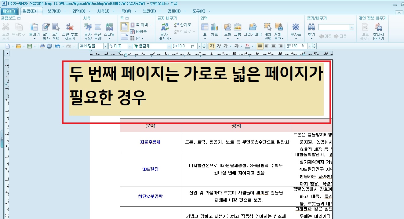 두 변째 페이지나 중간 페이지에 화면에 나온 것처럼 가로로 넓은 그림이나 표 등이 들어갈 때에는 편집용지가 세로보다는 가로가 어울리는 경우가 있습니다.