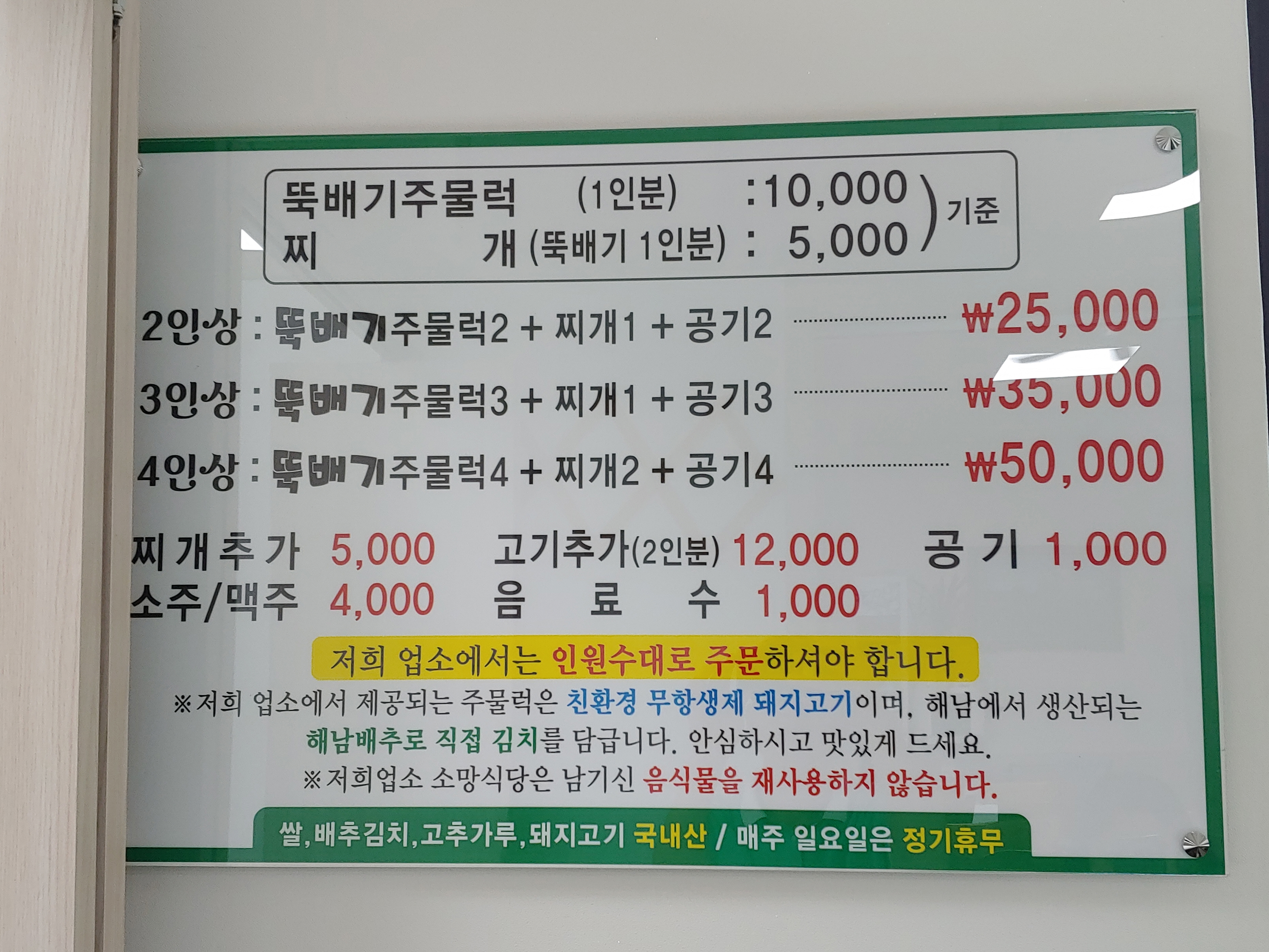 인원수대로 주문해야 하고, 주물럭 고기는 친환경 무항생제 돼지고기를 사용하고 있으며 해남배추로 김치를 담근다고 하니 안심하고 먹을 수 있겠습니다.