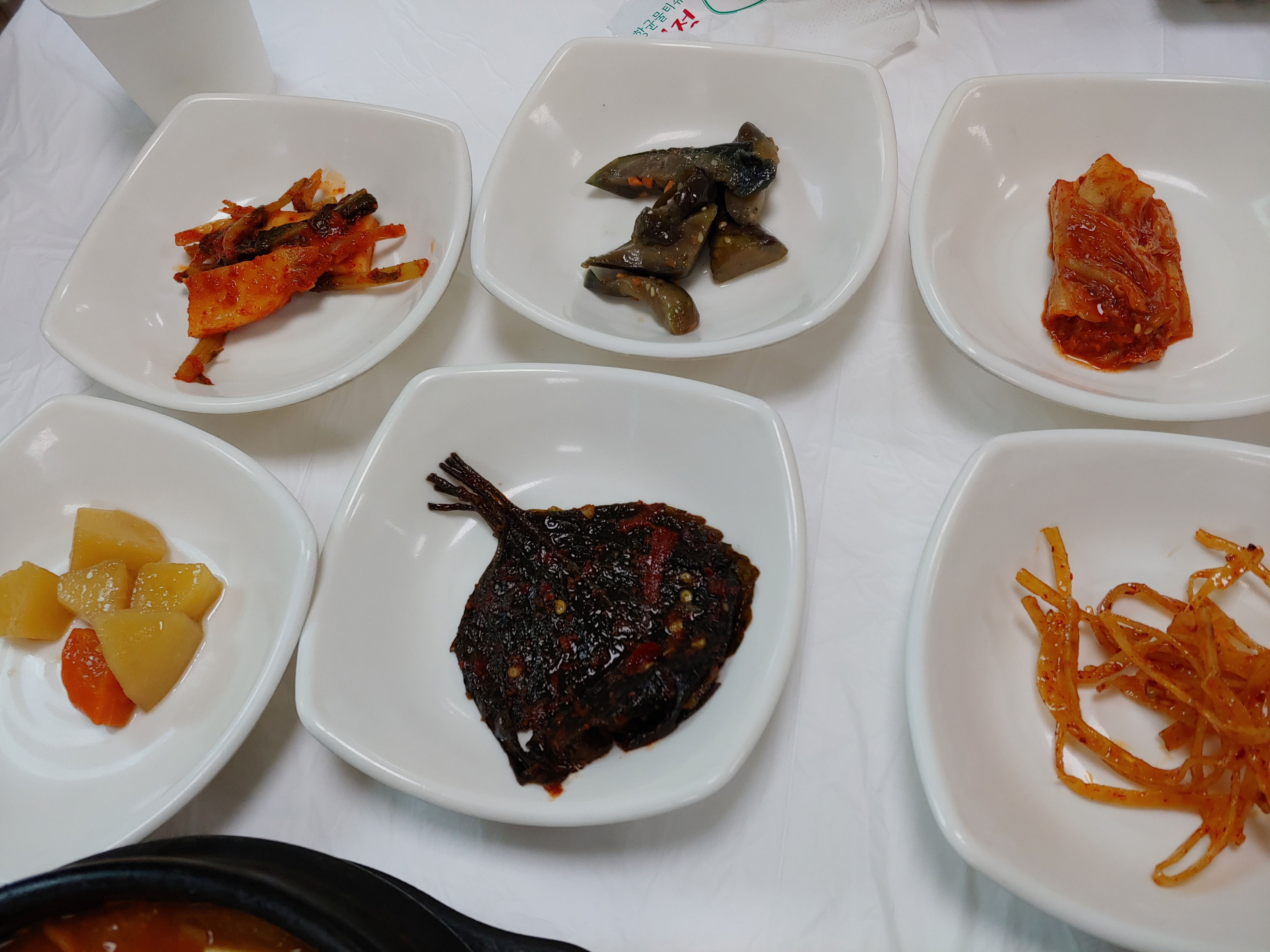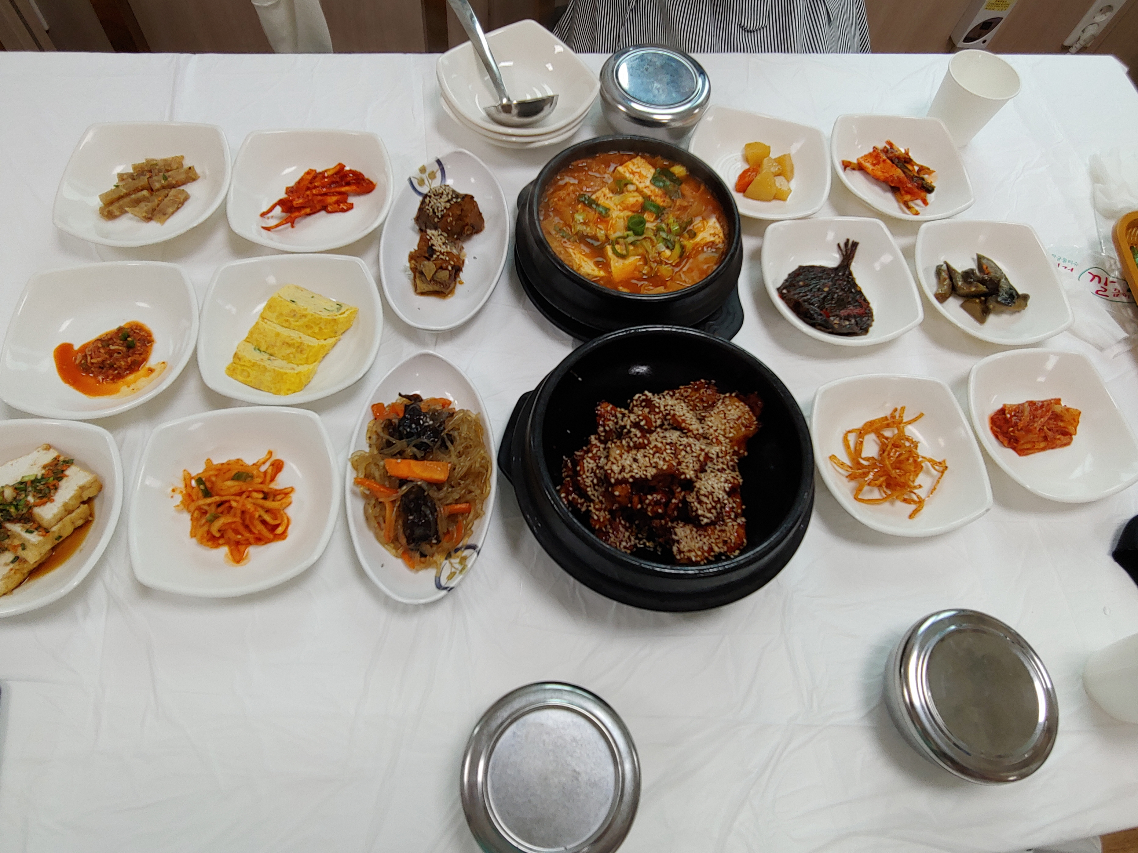 돋 세팅된 반찬과 주물럭과 김치찌개