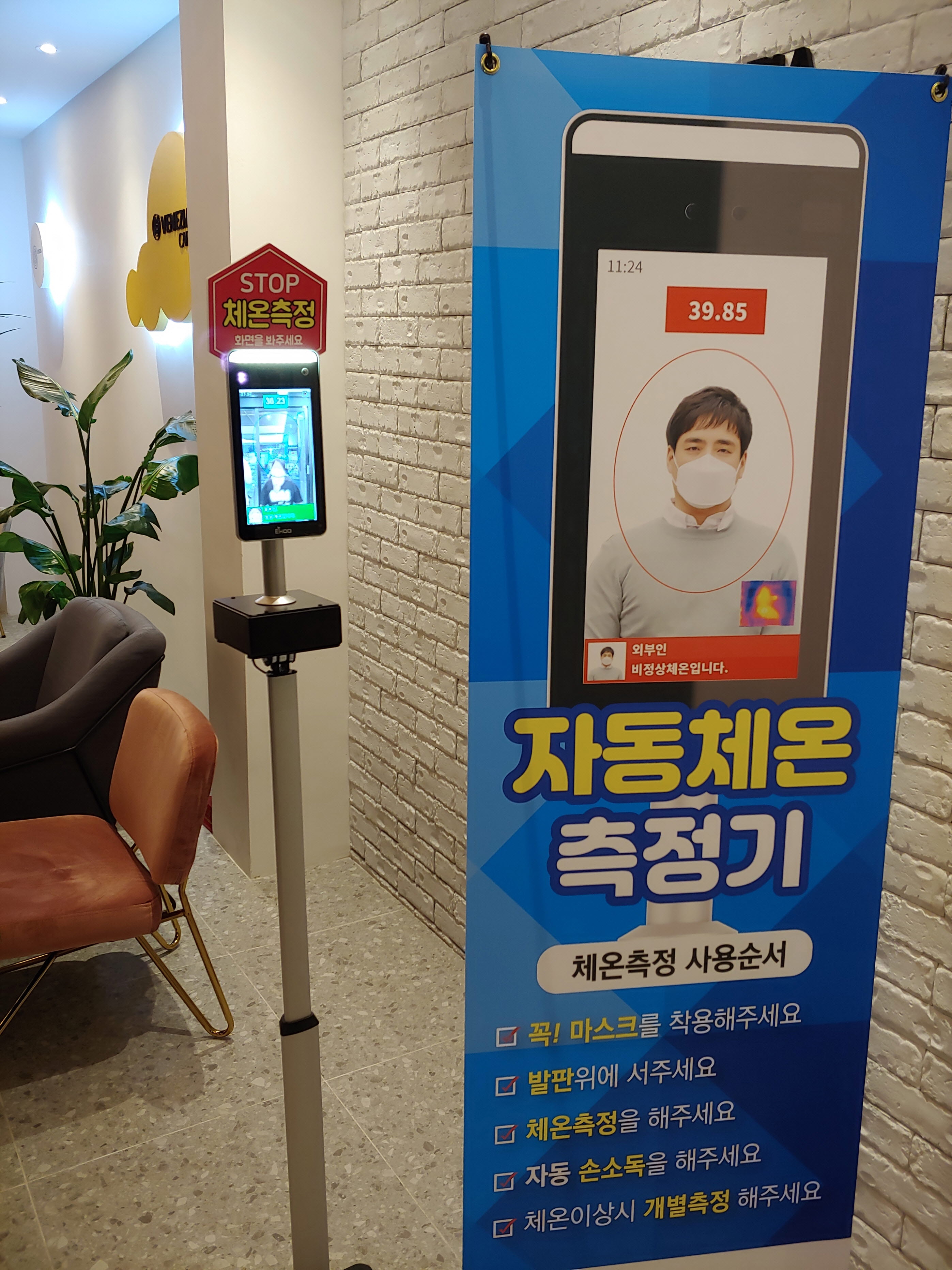 입구에 들어서면 체온을 재는 기계가 있습니다.