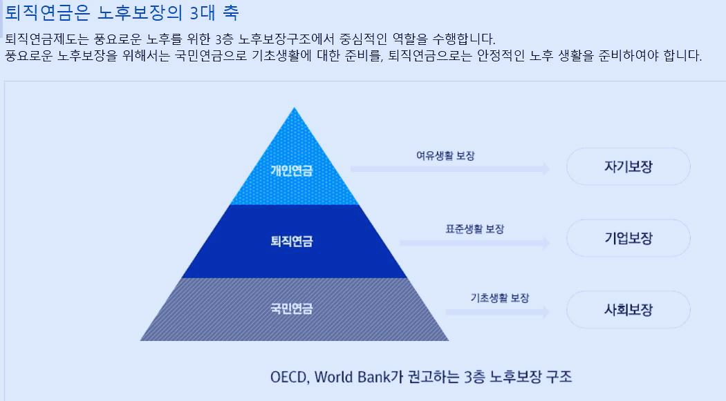 사회보장제도인 국민연금만으로는 은퇴 후에 살아갈 수 없다는 판단이 퇴직연금 제도를 도입하게 된 이유이기도 하고요.