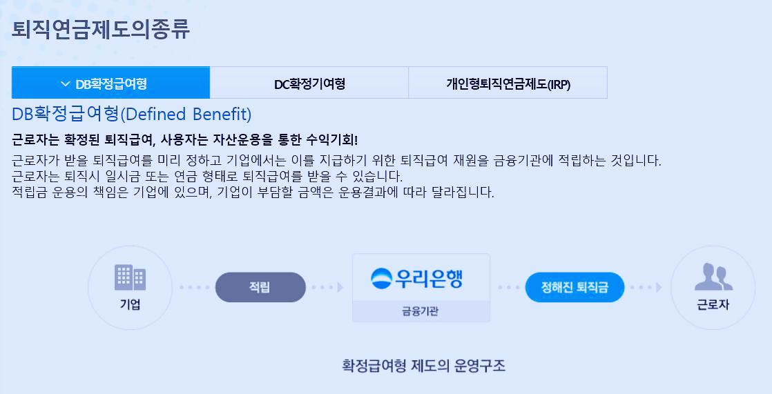 그럼 우리은행에서 알려주는 퇴직연금제도에 대해서 자세히 알아보겠습니다.