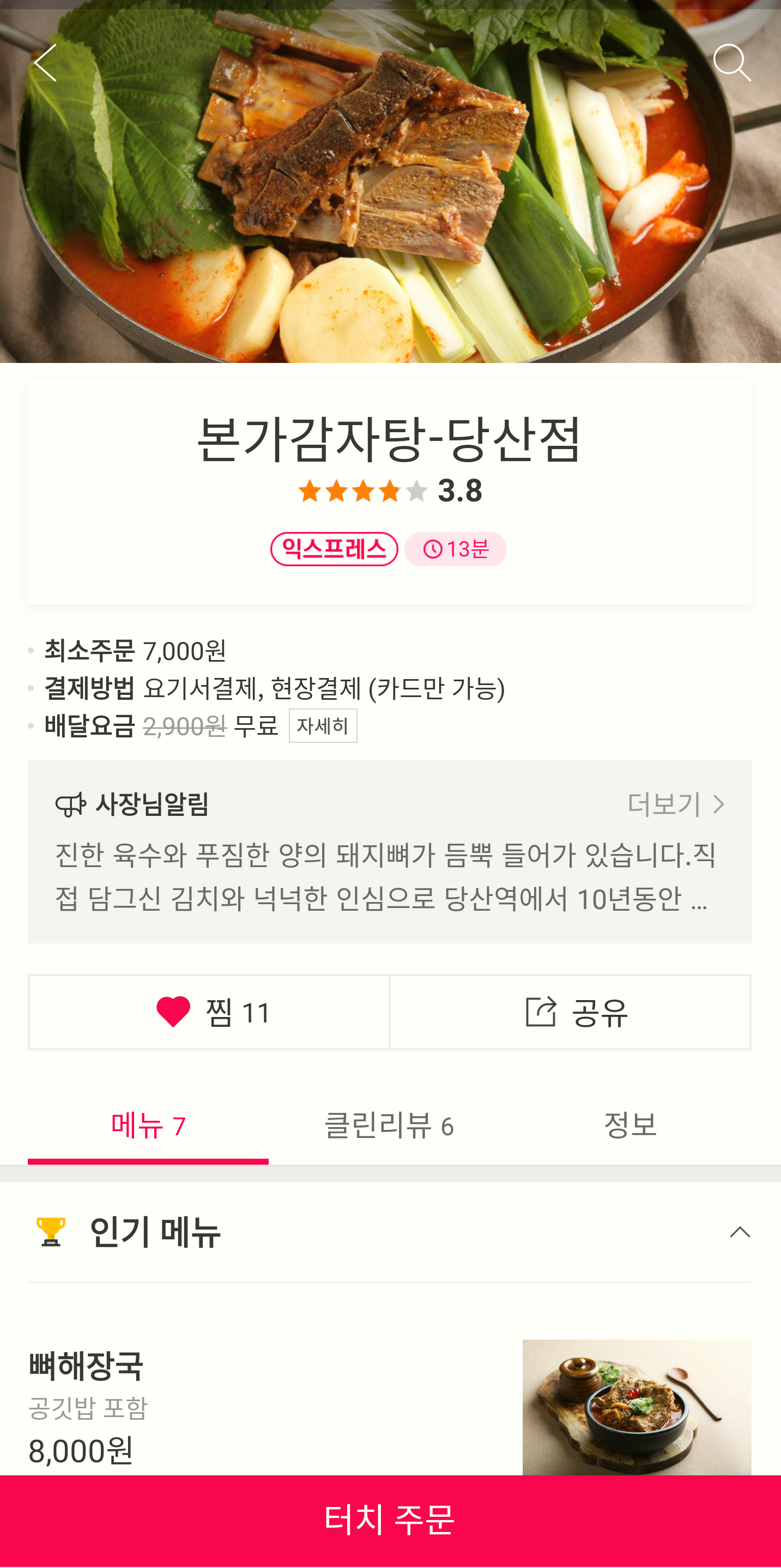 당산동과 양평동 근처 뼈해장국과 감자탕을 찾아 요기요에서 배달시켜 먹은 집은 당산역에 있는 본가 감자탕 당산점입니다.