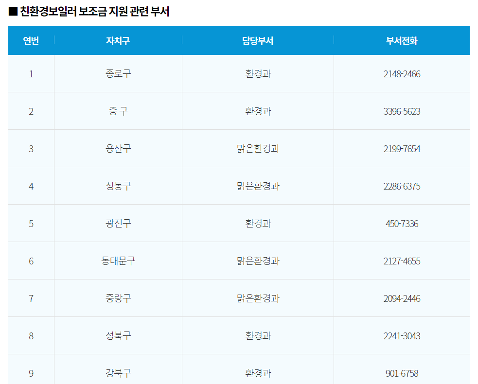 친환경 보일러 교체 보조금 지원과 관련된 사항은 각 구청 환경과에 문의하면 됩니다.