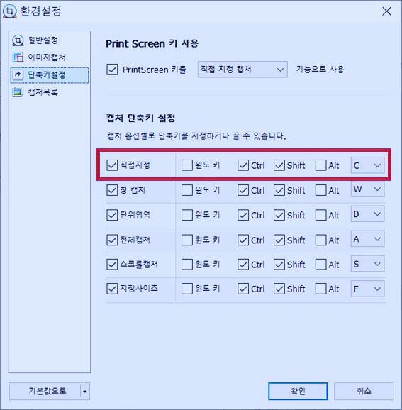 직접 지정해서 캡처하는 단축키는 Ctrl+Shift+C 키로 지정되어 있는데, 굳이 바꿀 필요는 없는 것 같네요.