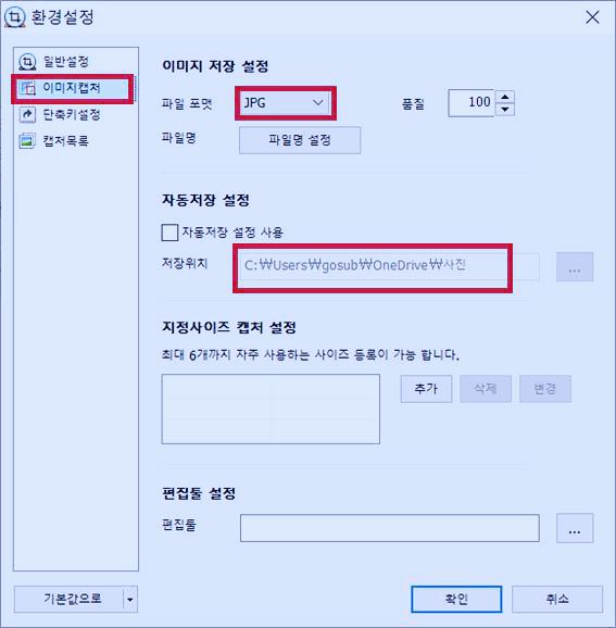 창캡처, 단위영역, 전체캡처, 스크롤캡처, 지정사이즈 등도 설정할 수 있으나 마우스로 선택할 수도 있으니 굳이 설정을 비 꿀 필요는 없을 듯...