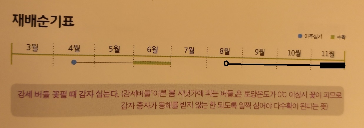 씨감자 심는 시기는 3월 말에서 4월 중순, 8월 하순 두 차례입니다.