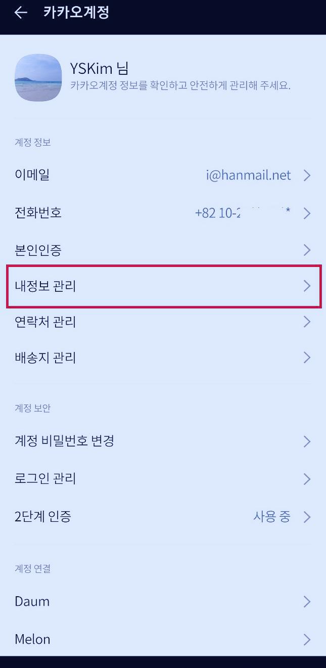 계정관리 페이지에 있는 '내 정보 관리'에 들어갑니다.