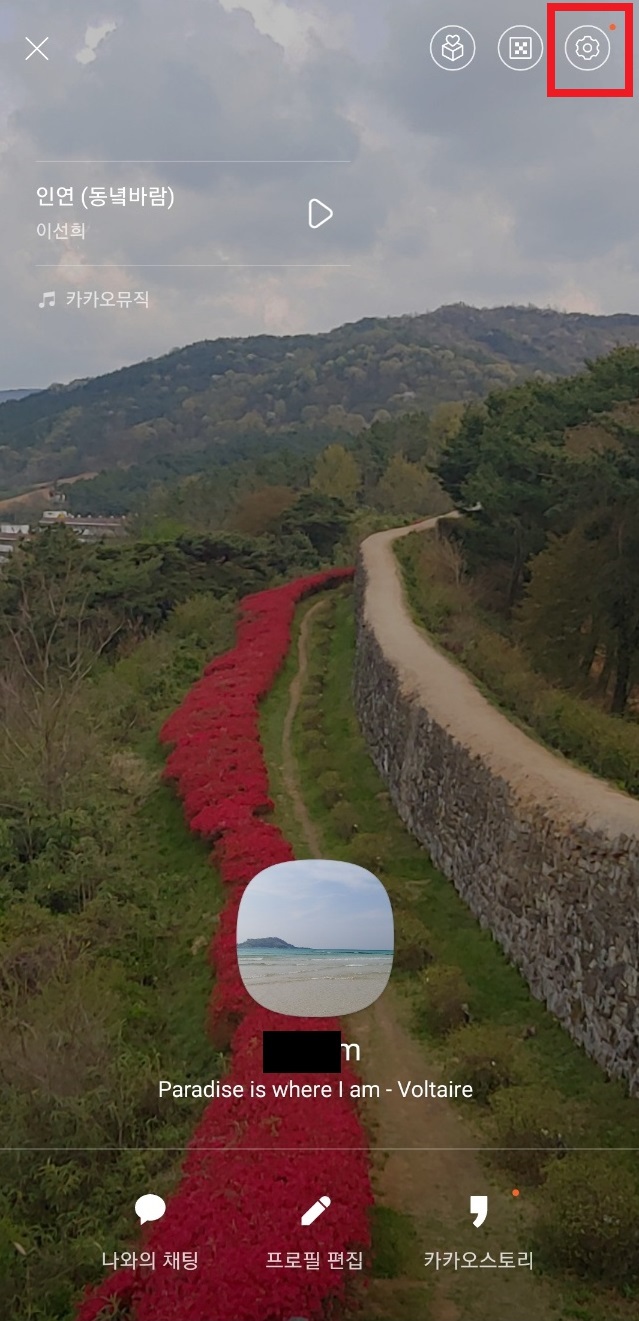 프로필 사진이 나오면 그곳에서 우측 상단의 톱니바퀴 모양의 '설정'을 선택합니다.